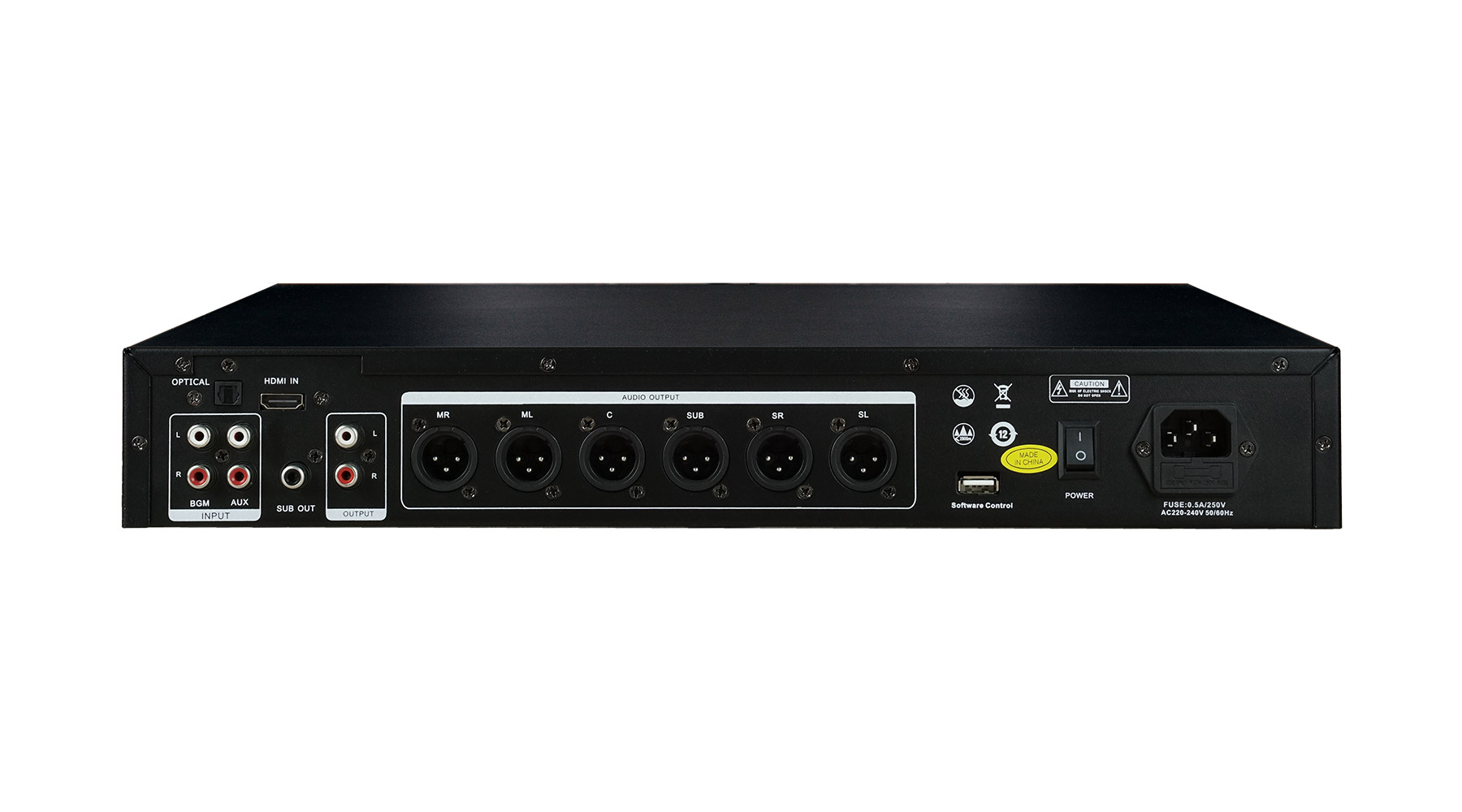 Các cổng ra XLR x 6 cổng tiêu chuẩn Main Right, Main Left, Center, Sub, Surround Right và Surround Left với các tinh chỉnh EQ riêng cho từng kênh cùng giới hạn khuếch đại đỉnh (Limiter) và bộ điều chỉnh độ trễ (Delay)