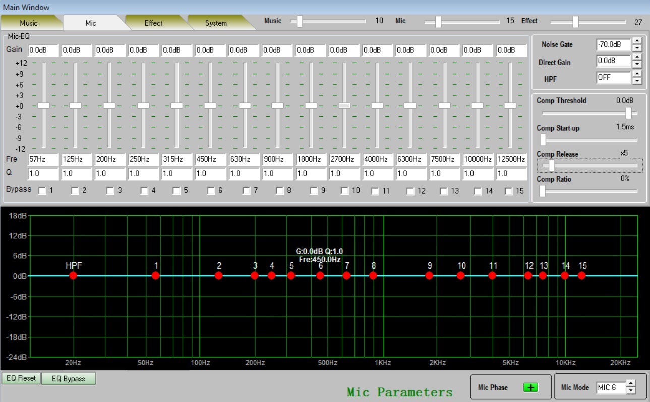 Phần tinh chỉnh Micro (Mic) có 15 cần EQ ( 15-band EQ ), HPF cắt tần số thấp, xử lý tiếng ồn (Noise Gate) và Compressor cho riêng mỗi nhóm Micro.