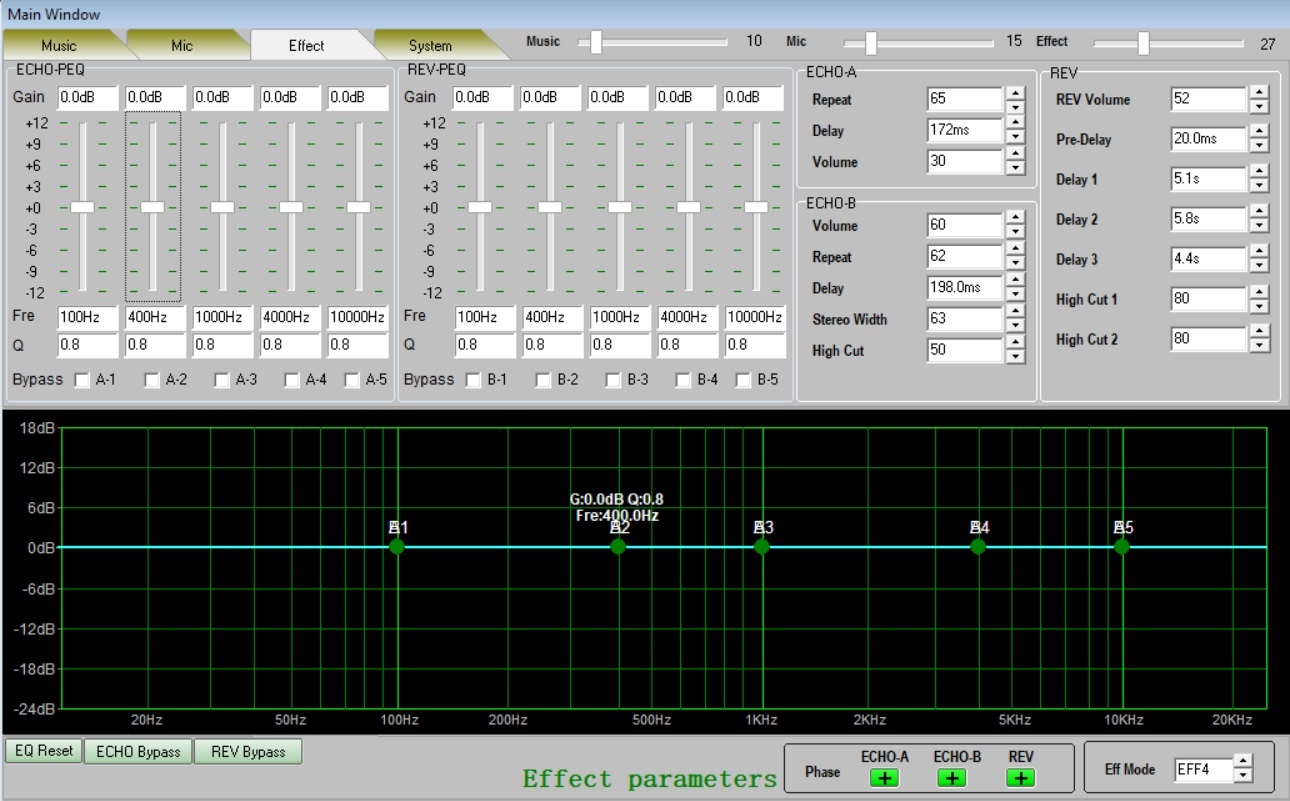 Ngoài 4 chế độ KTV1, KTV2, KTV3, KTV4 cài đặt mặc định có sẵn phù hợp với giọng hát từng người và từng thể loại nhạc, Mixer Boston Acoustics BA5000 còn có thêm 4 chế độ cá nhân tùy chỉnh EFF1 ->EFF4 ( REV1 -> REV4 ), lưu lại tạo file trên máy tính, thuận tiện sử dụng khi cần.