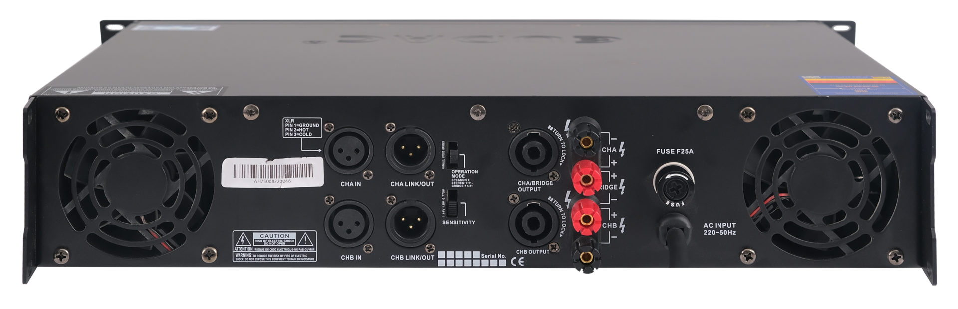 Mặt sau cục đẩy EUDAC AUDIO AH-750 được bố trí các cổng kết nối khoa học với các chú thích chi tiết thuận tiện người dùng kết nối. Đặc biệt với hệ thống quạt tản nhiệt hoạt động hiệu quả giúp cho cục đẩy hoạt động liên tục trong thời gian dài mà không gây ra hiện tượng nóng máy đảm bảo độ bền của thiết bị.