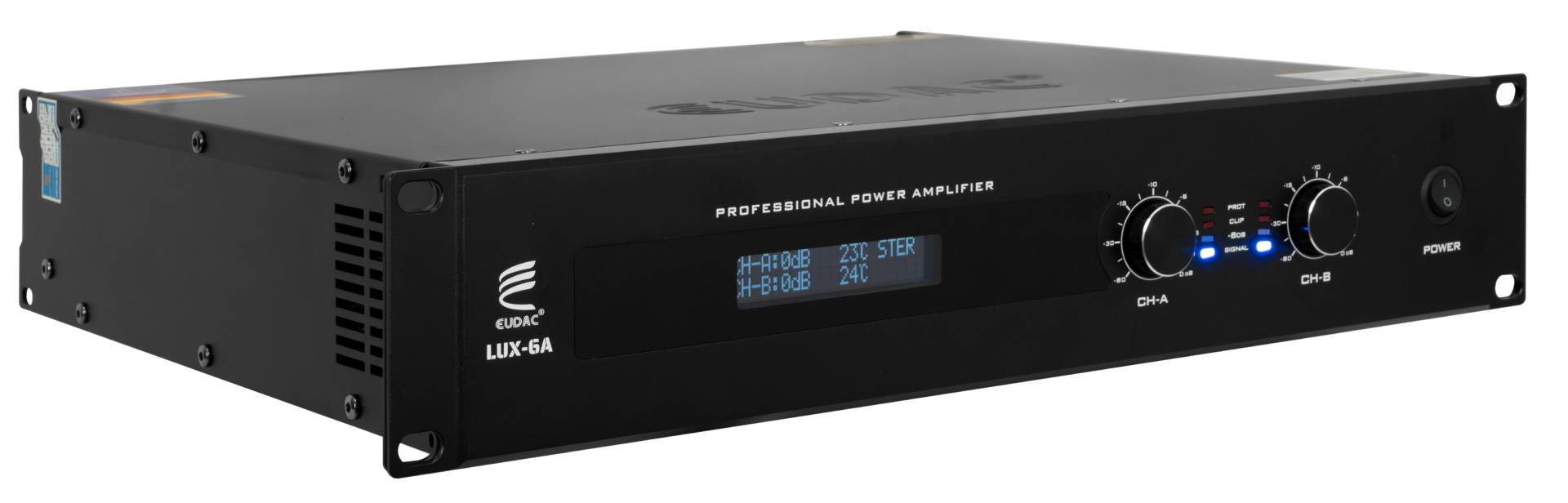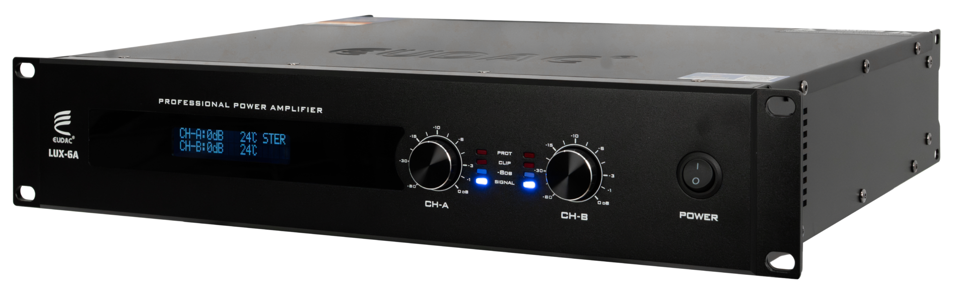 Bên phải là công tắc nguồn lớn, được bố trí hợp lý để thao tác thuận tiện. Toàn bộ thiết kế mặt trước tuân thủ chuẩn rack 2U, dễ dàng lắp đặt vào tủ rack kỹ thuật chuyên nghiệp. Với kiểu dáng tinh gọn, bố cục trực quan và chất liệu chắc chắn, MAIN EUDAC AUDIO LUX-6A thể hiện sự đồng bộ giữa hiệu năng và thẩm mỹ, phù hợp với các hệ thống âm thanh yêu cầu tính ổn định và dễ kiểm soát.