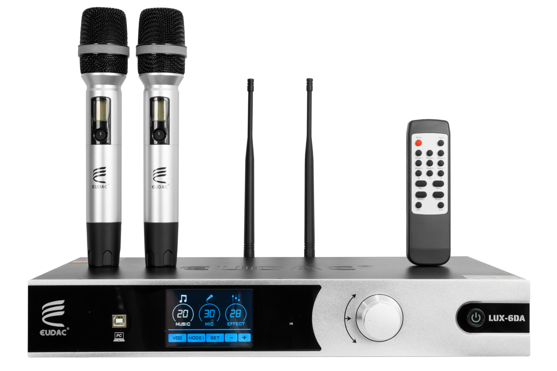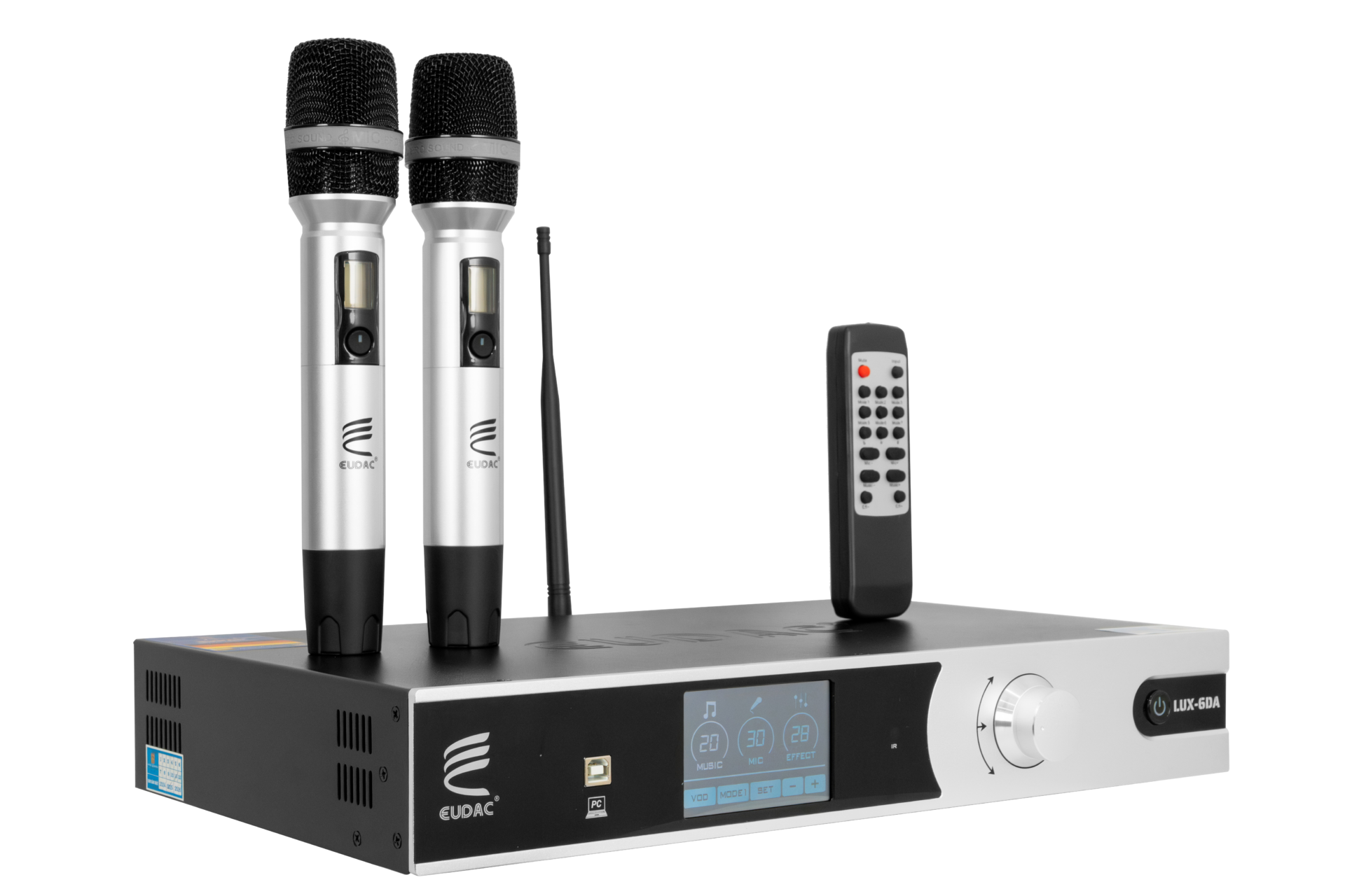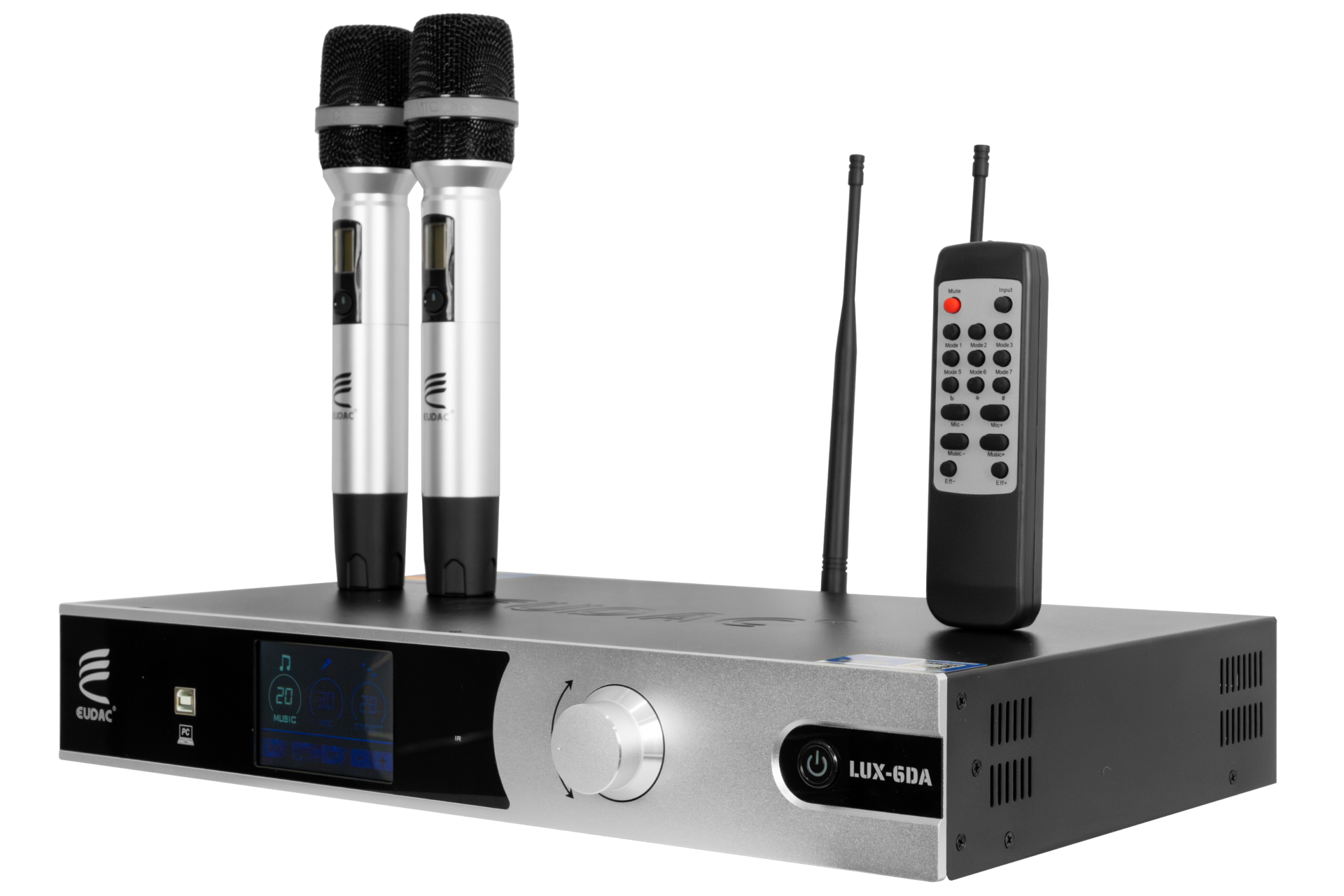 Ampli 3in1 EUDAC LUX-6DA sở hữu thiết kế hiện đại, sang trọng với lớp vỏ ngoài bằng kim loại nhôm phay xước màu bạc, mang lại vẻ chắc chắn và đẳng cấp. Mặt trước của thiết bị nổi bật với màn hình cảm ứng LCD sắc nét, cho phép hiển thị đầy đủ thông số như mức âm lượng nhạc, micro và hiệu ứng. Các nút bấm chức năng được bố trí gọn gàng ngay dưới màn hình, hỗ trợ người dùng điều khiển dễ dàng các chế độ hoạt động như SET, MODE, MUSIC…