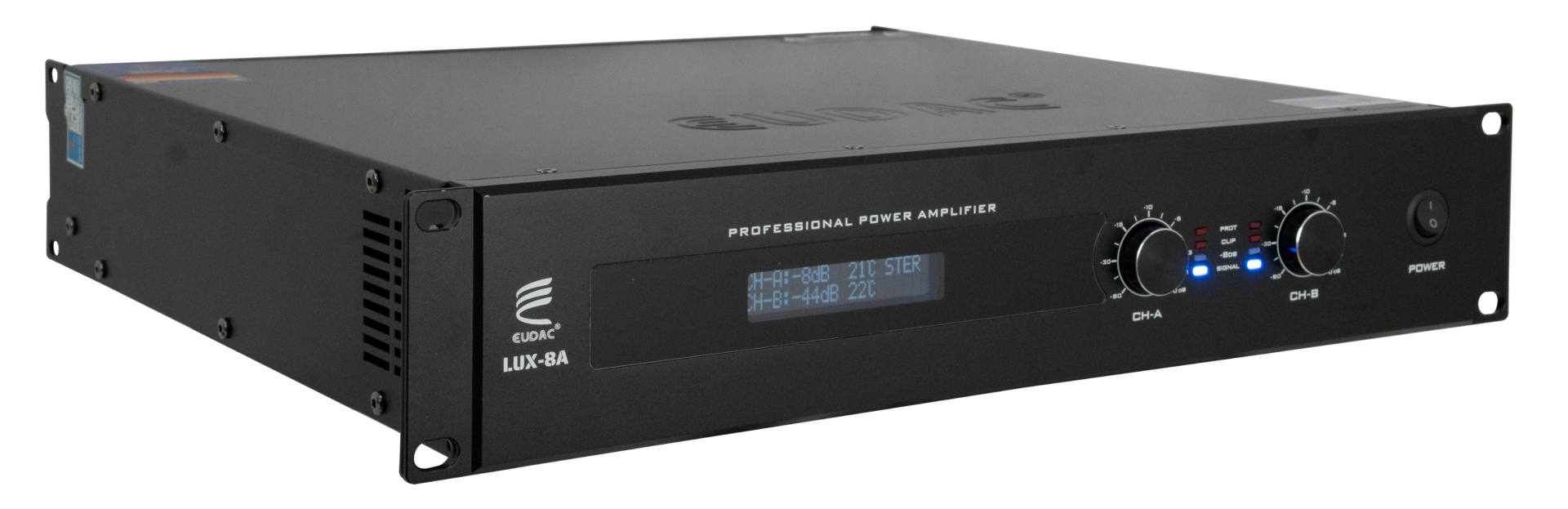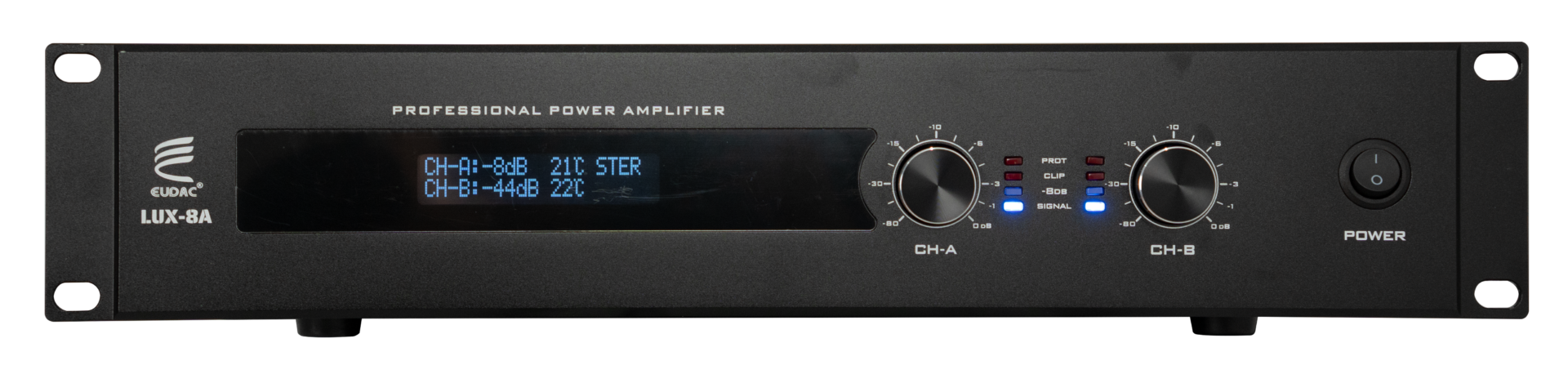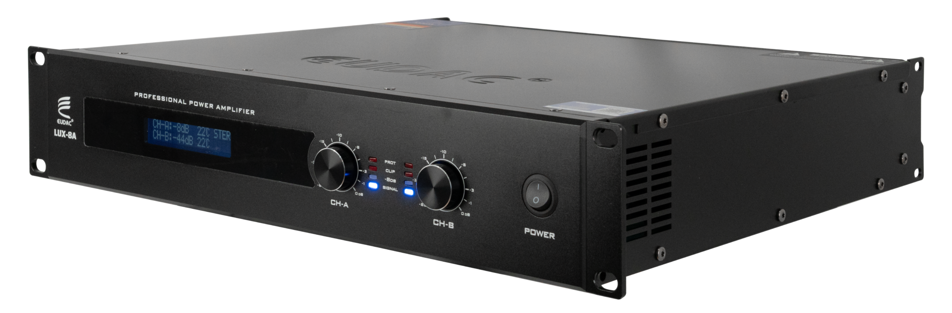 Phía trước cục đẩy được chia bố cục rõ ràng và gọn gàng. Bên trái là logo EUDAC cùng tên model “LUX-8A” được in sắc nét. Ở trung tâm là màn hình LED hiển thị các thông số như mức âm lượng, nhiệt độ hoạt động và chế độ tín hiệu đầu ra (Stereo hoặc Bridge), giúp người dùng giám sát hoạt động của thiết bị một cách trực quan. Bên cạnh màn hình là hai núm xoay điều chỉnh âm lượng riêng biệt cho từng kênh CH-A và CH-B, được thiết kế dạng lớn với vạch chia rõ ràng, hỗ trợ thao tác nhanh và chính xác. Nút nguồn (POWER) nằm bên phải, dễ nhận diện và sử dụng.