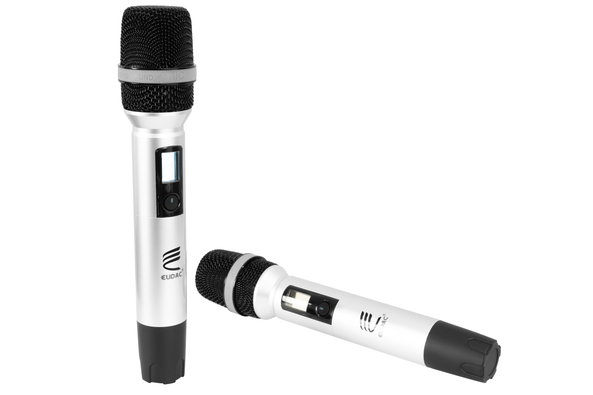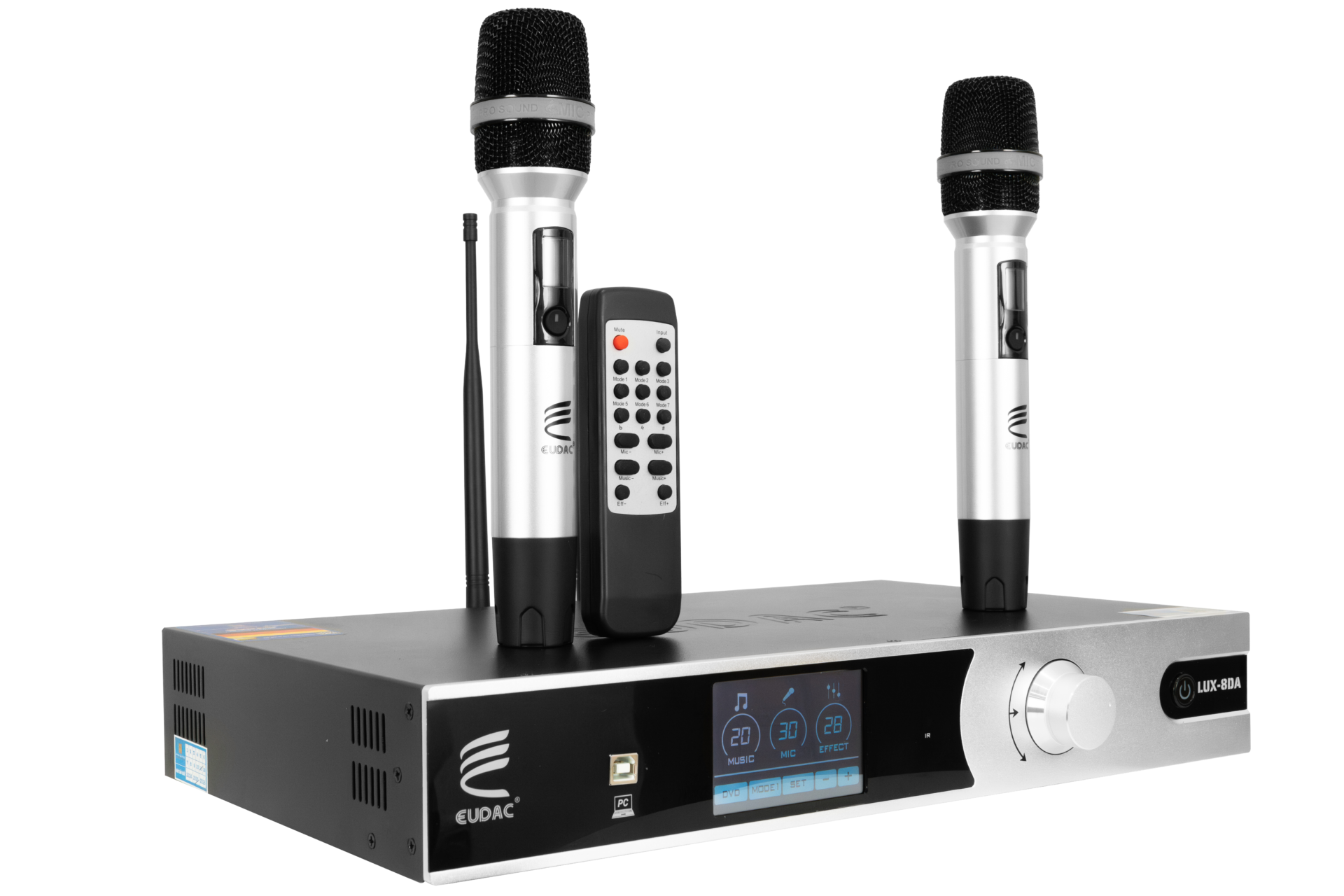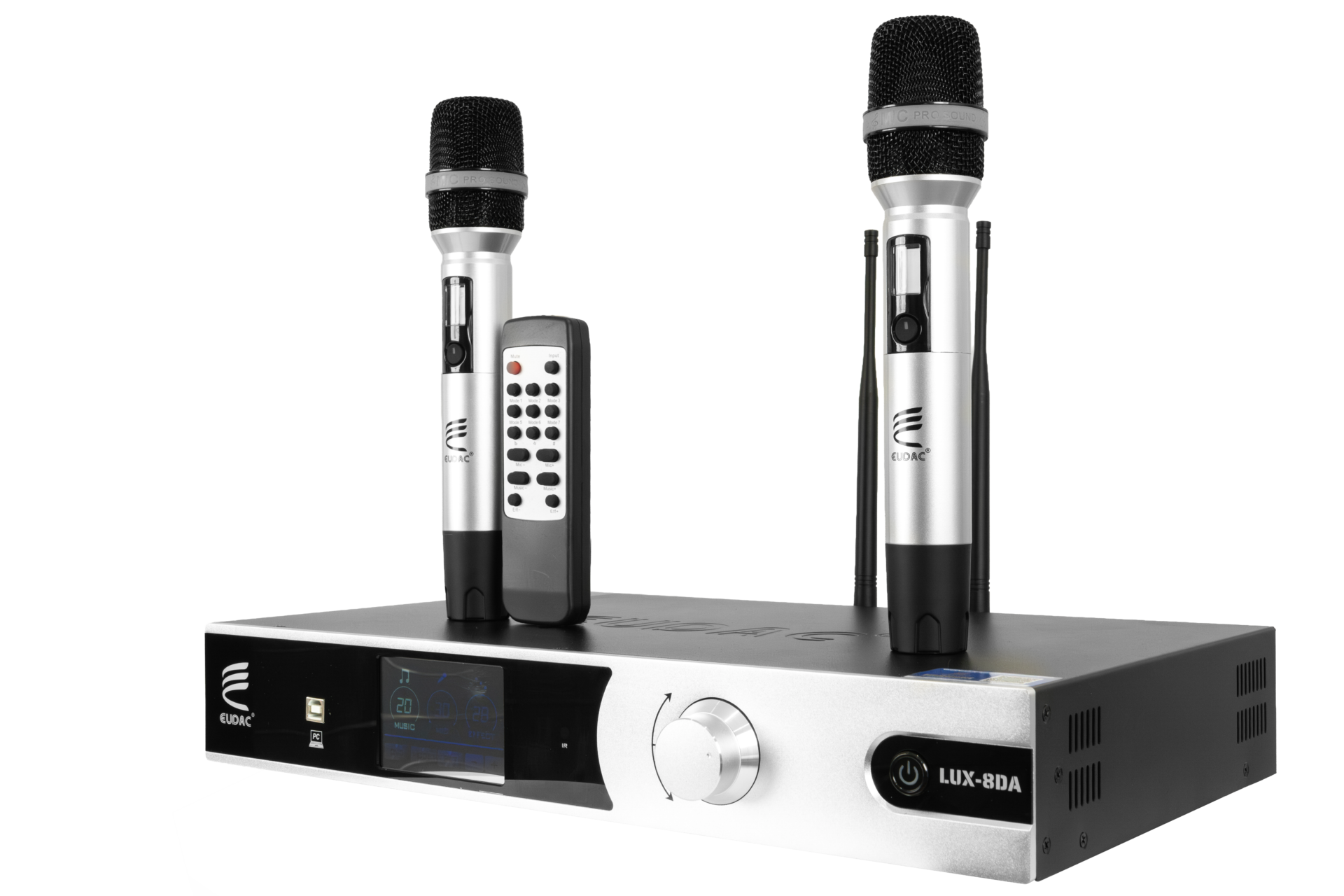 EUDAC LUX-8DA được trang bị hai micro không dây cao cấp, cùng tông màu bạc với amply tạo nên sự đồng nhất. Micro được thiết kế nhỏ gọn, thân cầm chắc tay, nút nguồn lớn giúp thao tác dễ dàng. Phần lưới micro dạng kim loại sáng bóng tạo cảm giác bền bỉ và hiện đại. Logo EUDAC in sắc nét trên thân, góp phần tạo nên sự chuyên nghiệp của toàn bộ hệ thống. Mặt sau ngoài các cổng kết nối đa dạng là ăng-ten thu sóng linh hoạt, giúp nâng cao khả năng bắt sóng và đảm bảo tín hiệu ổn định khi hát. Thiết kế gọn, dễ gấp gọn khi không sử dụng, góp phần giữ tổng thể sạch sẽ và gọn mắt.