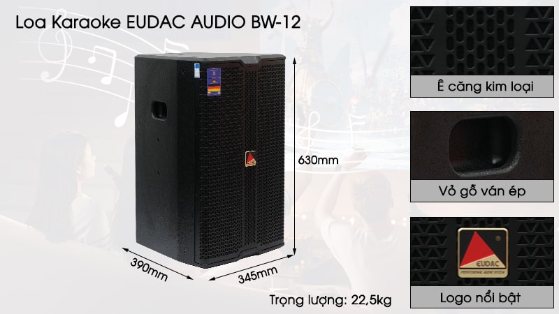 Với kích thước 630x345x390mm và trọng lượng chỉ 22,5kg, loa Full EuDAC BW-12 thiết kế nhỏ gọn, dễ dàng di chuyển và lắp đặt. Bên cạnh đó, loa được thiết kế với chất liệu cao cấp, đảm bảo sự bền bỉ và hiệu suất ổn định trong thời gian dài.
