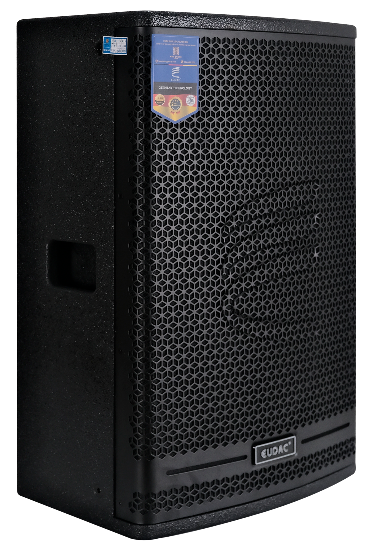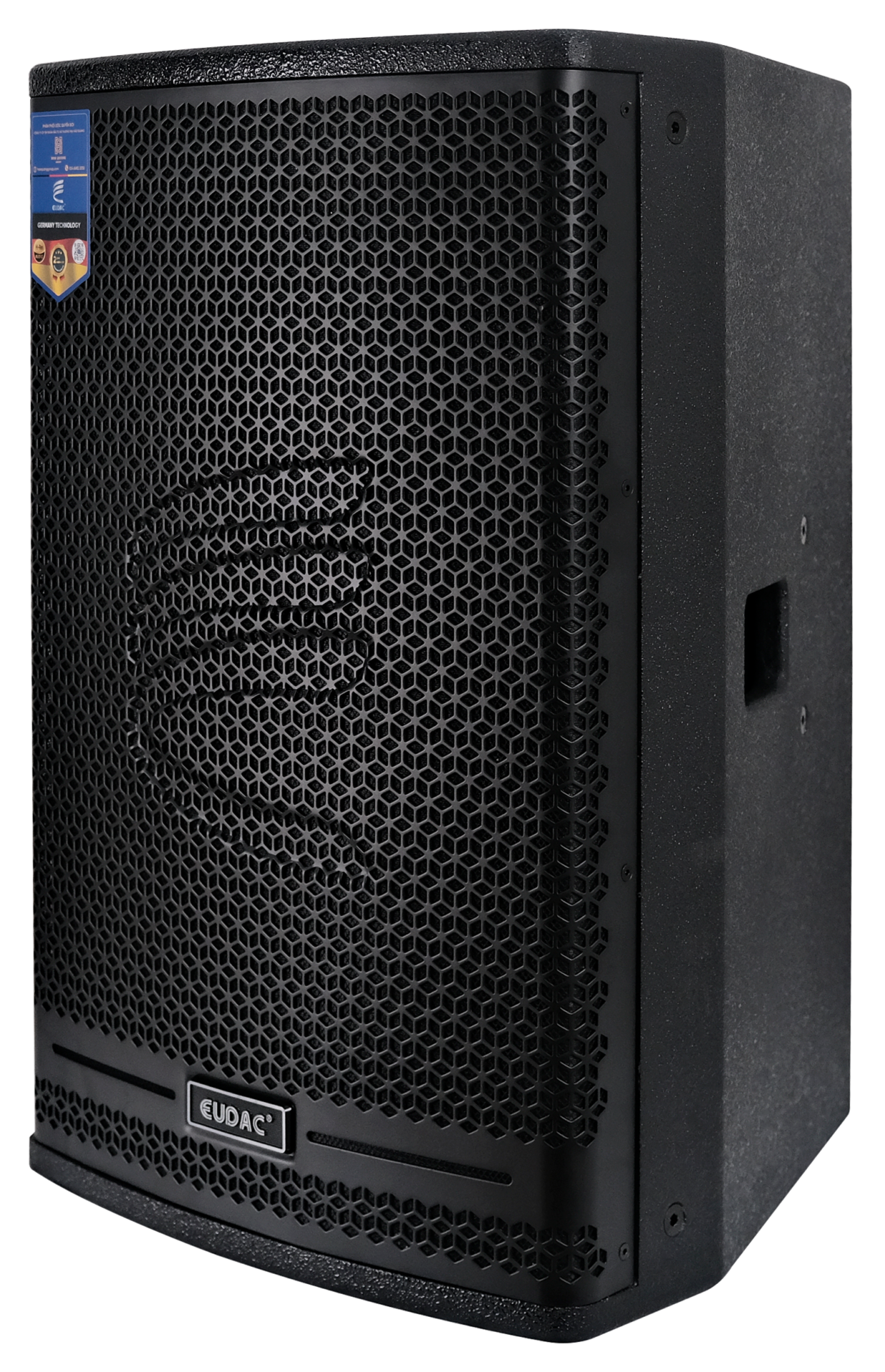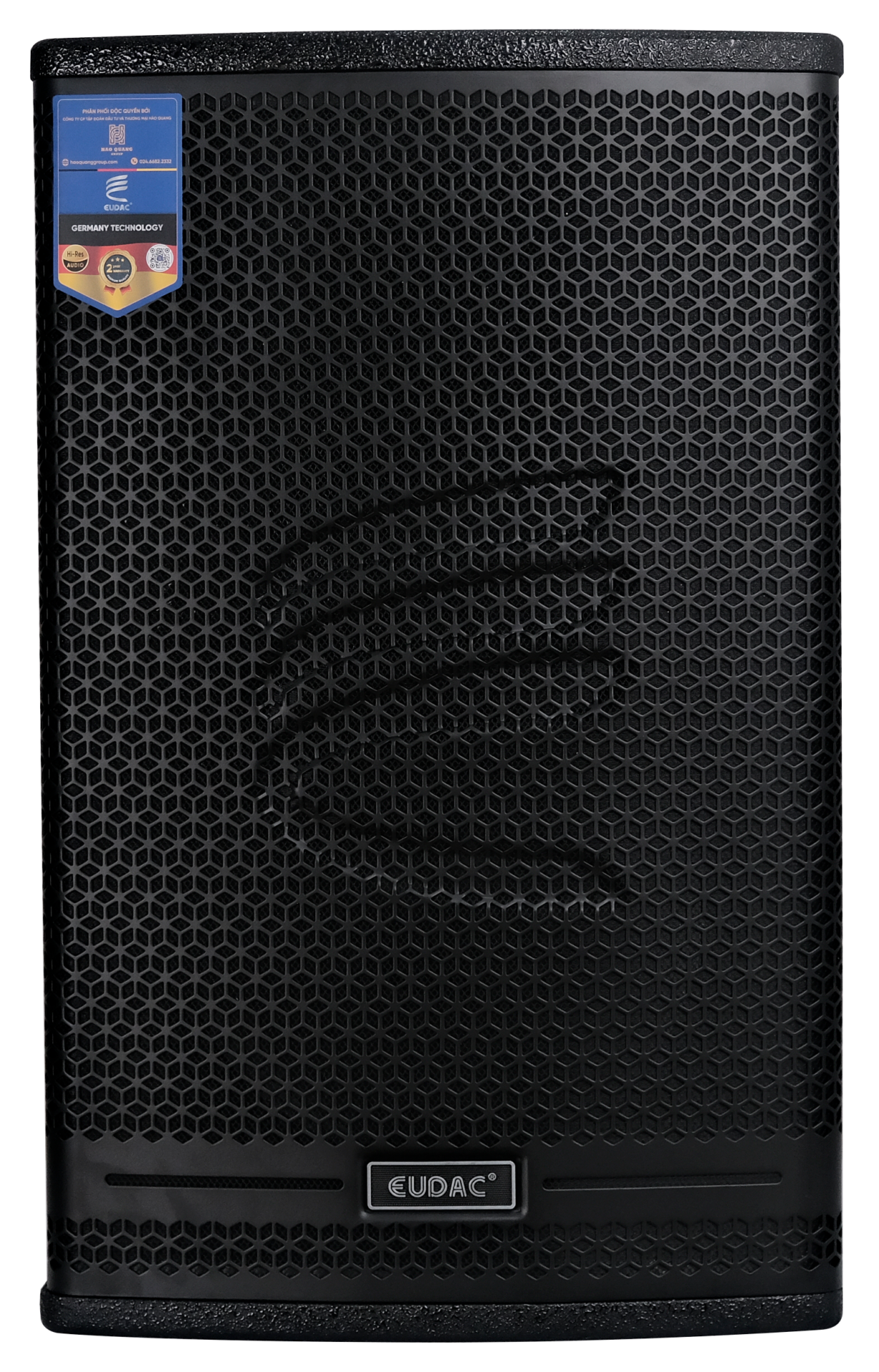 Mặt trước loa được bảo vệ bởi lưới ê-căng kim loại dạng tổ ong chắc chắn, sơn tĩnh điện màu đen giúp chống bụi, chống va đập và tối ưu khả năng thoát âm. Ở trung tâm lưới là logo thương hiệu EUDAC nổi bật, cùng họa tiết vân cách điệu giúp tăng tính nhận diện thương hiệu và tạo điểm nhấn thẩm mỹ. Phần mặt lưới hơi cong nhẹ giúp tăng khả năng tán âm và làm mềm thiết kế tổng thể.