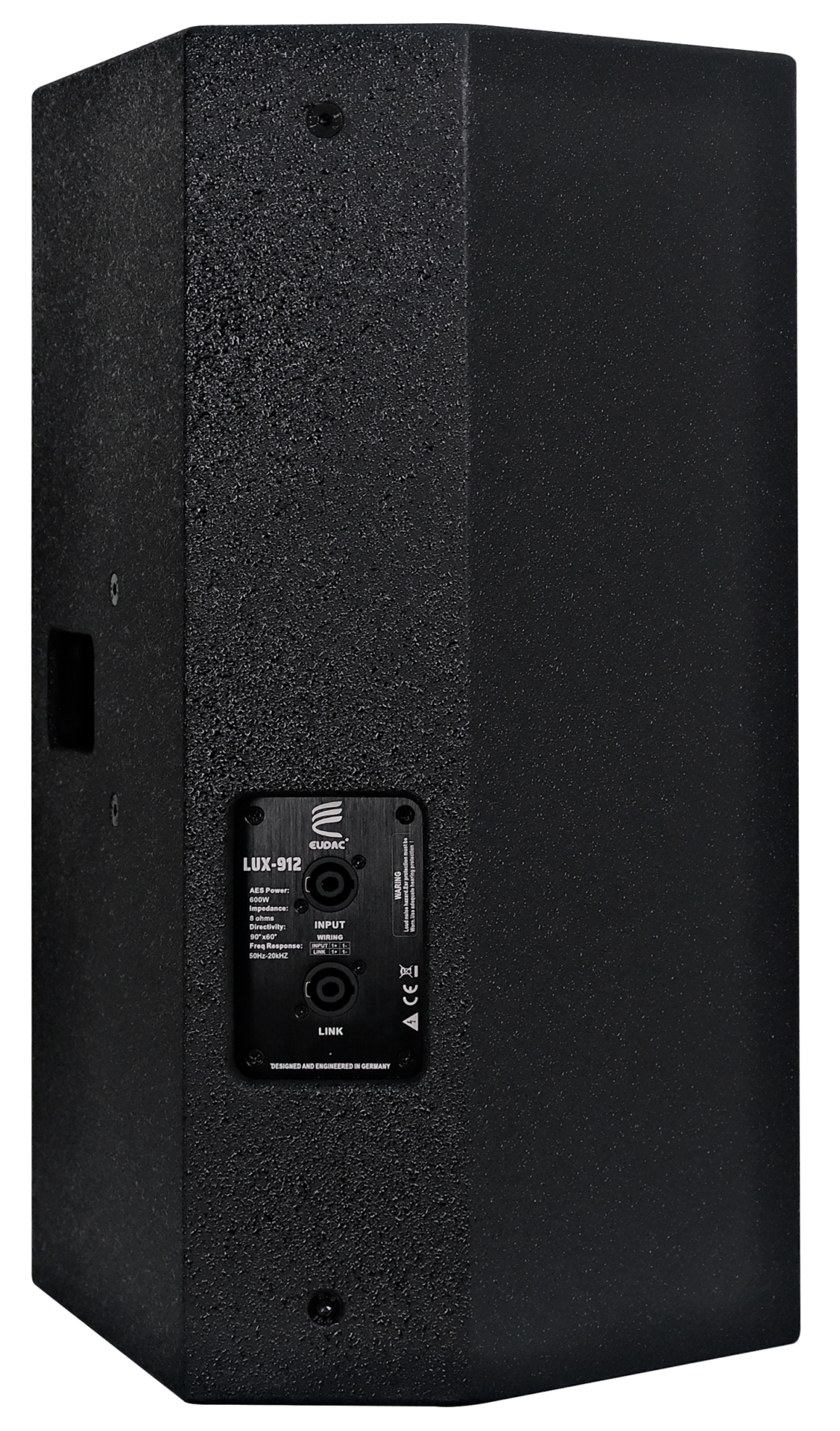 Mặt sau của EUDAC LUX-912 được bố trí gọn gàng với cụm 2 cổng Speakon tiêu chuẩn (Input/Link Out). Đây là chuẩn kết nối chuyên dụng trong âm thanh chuyên nghiệp, cho phép truyền tín hiệu chắc chắn, ổn định và an toàn, đồng thời hỗ trợ kết nối nhiều loa dễ dàng. Tem nhãn thông số kỹ thuật được in rõ ràng, hiển thị công suất, trở kháng và các cảnh báo an toàn cần thiết, thuận tiện cho người dùng trong quá trình lắp đặt và vận hành.