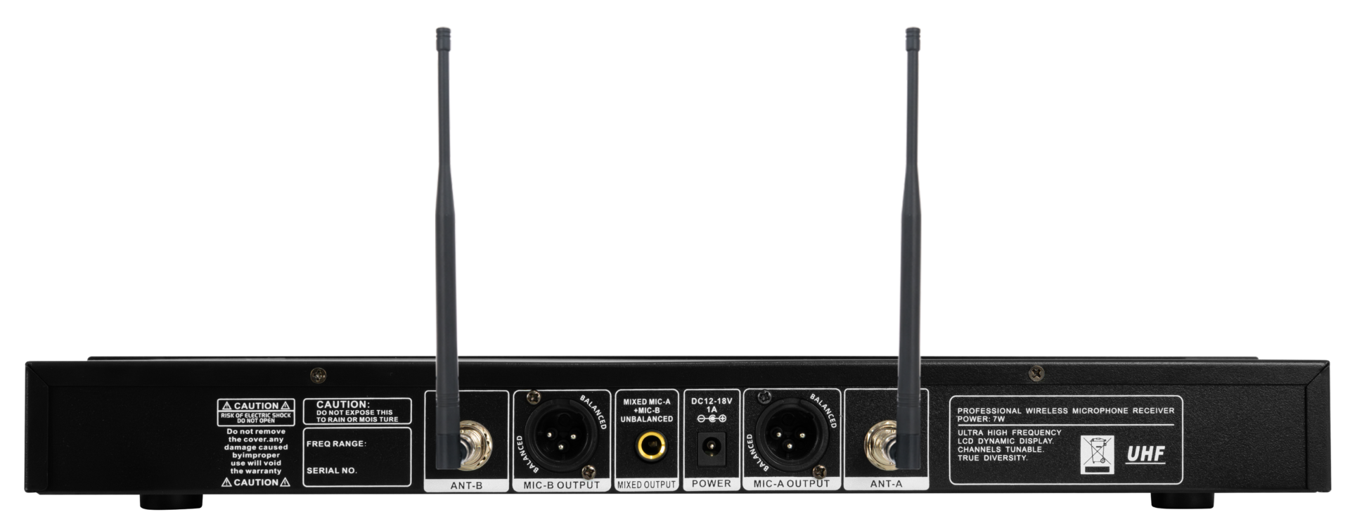 Hệ thống hoạt động ở băng tần UHF (580-630MHz) giúp giảm thiểu nhiễu tín hiệu từ các thiết bị khác và đảm bảo độ ổn định cao, đặc biệt trong môi trường có nhiều thiết bị điện tử hoặc tín hiệu sóng phức tạp. Ngoài ra, công nghệ lọc âm và chống nhiễu tích hợp trong đầu thu giúp loại bỏ tạp âm, mang lại âm thanh sạch, chân thực hơn.