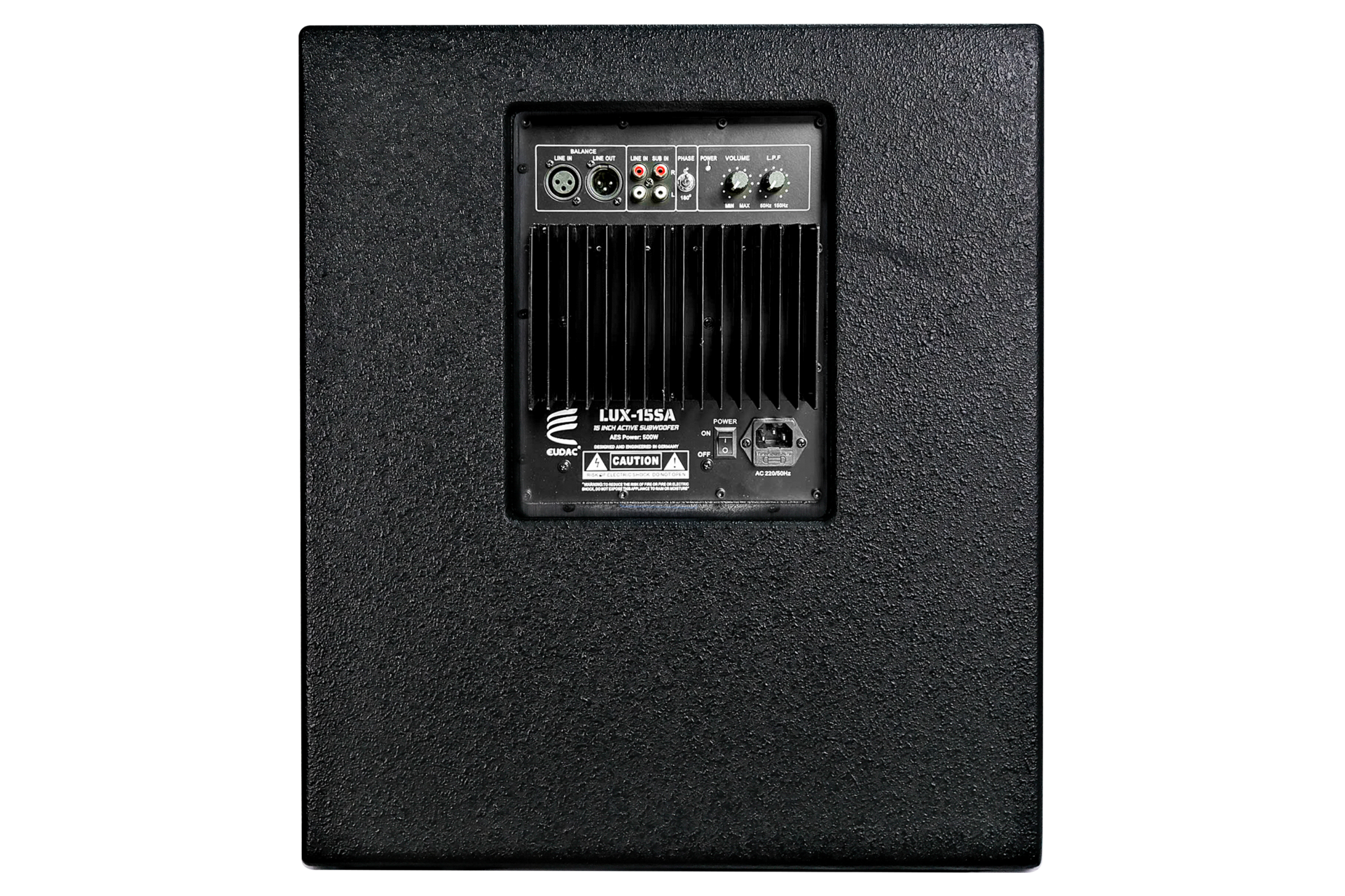 Mặt sau của EUDAC LUX-15SA được thiết kế gọn gàng và khoa học, tích hợp đầy đủ các cổng kết nối và nút điều khiển cần thiết cho việc tối ưu hiệu suất âm trầm. Hệ thống bao gồm cổng Balance XLR (LINE IN và LINE OUT) cho kết nối chuyên nghiệp, cổng RCA (LINE IN và SUB IN) tương thích với nhiều nguồn phát, cùng công tắc PHASE (0°/180°) giúp đồng bộ pha âm bass với loa chính. Nút VOLUME cho phép điều chỉnh âm lượng linh hoạt, trong khi bộ lọc tần số thấp L.P.F giúp kiểm soát dải bass hài hòa với toàn hệ thống. Trung tâm bảng điều khiển là bộ tản nhiệt nhôm lớn đảm bảo loa vận hành ổn định, tránh quá nhiệt khi hoạt động lâu ở công suất cao. Phía dưới là công tắc nguồn, cổng cấp điện AC 220V/50Hz và các tem cảnh báo an toàn, tất cả được bố trí hợp lý, vừa dễ thao tác vừa đảm bảo độ bền và an toàn khi sử dụng.