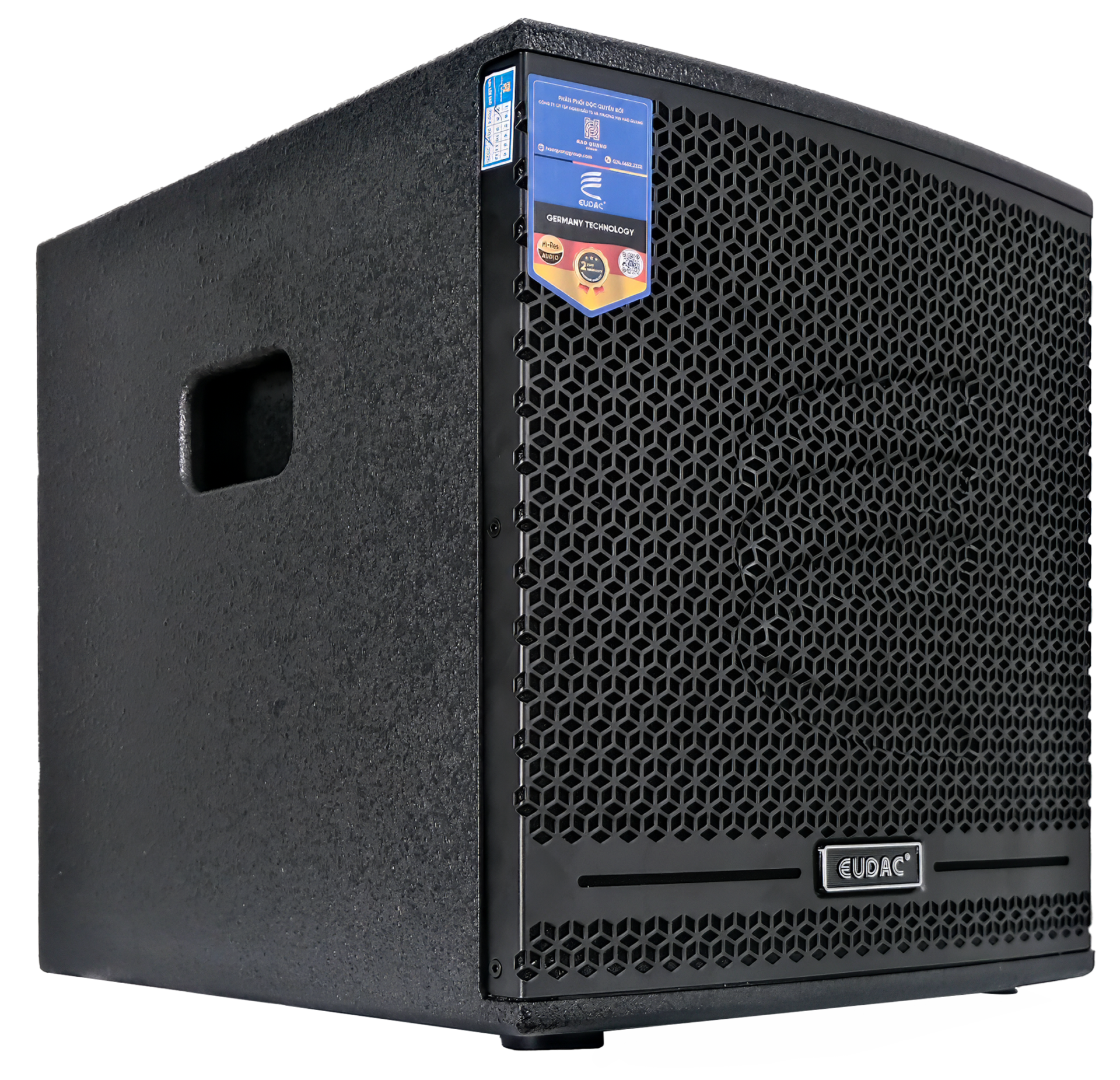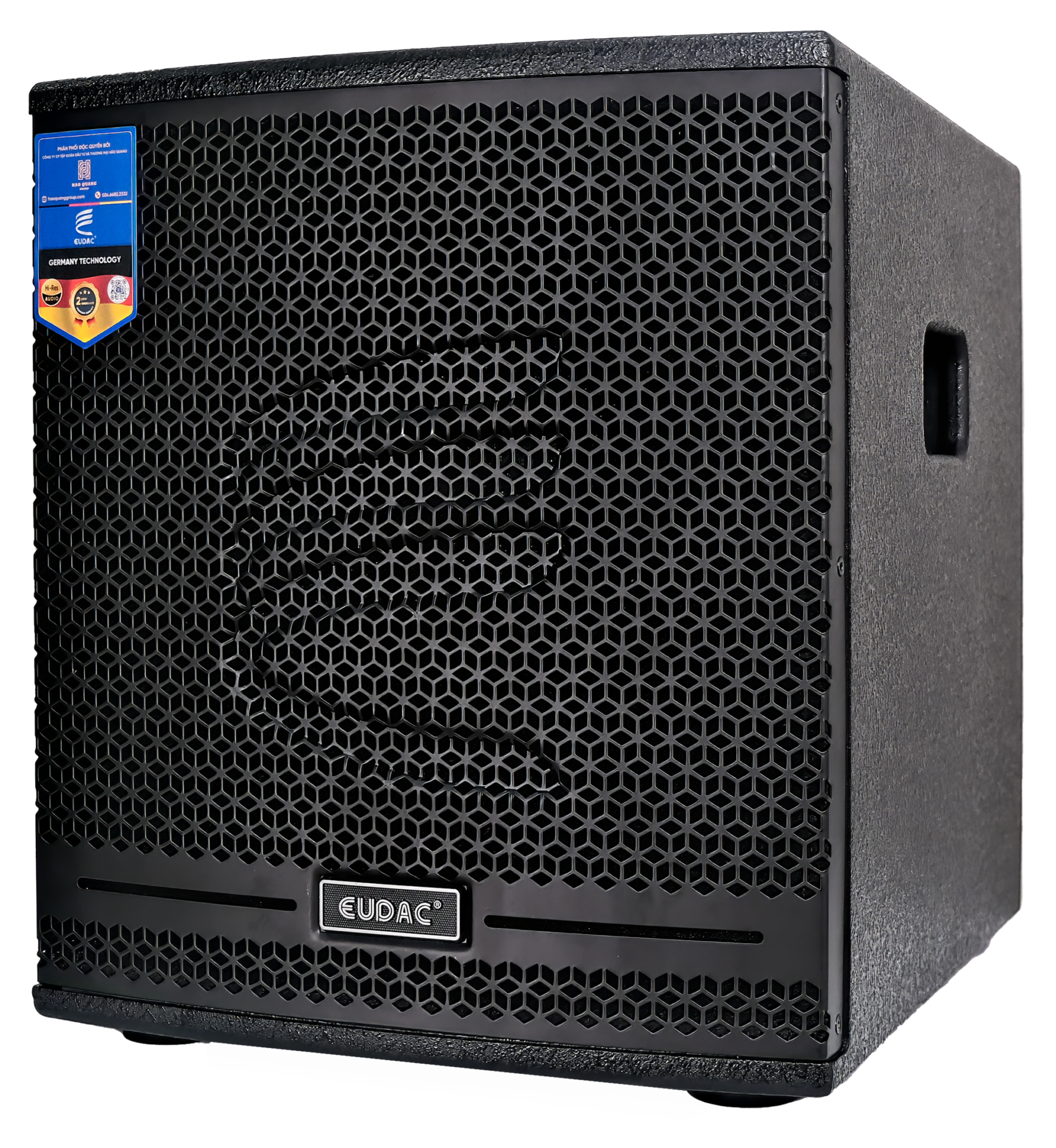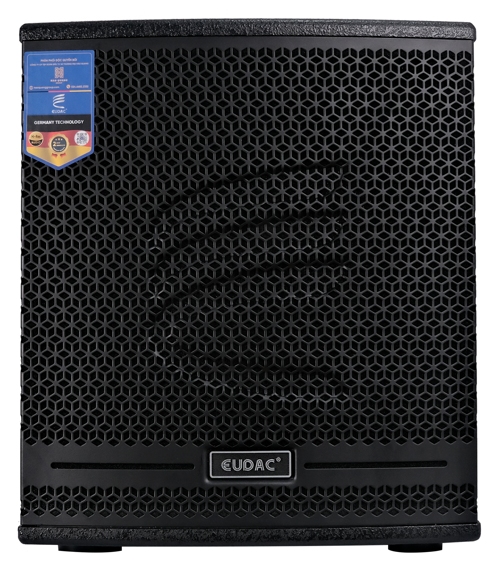 Loa sub điện EUDAC AUDIO LUX-15SA sở hữu ngoại hình vuông vức, chắc chắn với gam màu đen chủ đạo, mang đến vẻ ngoài hiện đại và chuyên nghiệp. Mặt trước của loa được trang bị lưới thép dày phủ sơn tĩnh điện dạng tổ ong, giúp bảo vệ củ loa bên trong khỏi bụi bẩn, va đập mà vẫn đảm bảo âm thanh thoát ra rõ ràng. Chính giữa lưới là logo thương hiệu EUDAC nổi bật và các đường gân cách điệu tạo điểm nhấn riêng cho dòng sản phẩm. Bên cạnh đó logo thương hiệu cũng được đặt nổi bật ở trung tâm đáy lưới, tạo điểm nhấn nhận diện tinh tế.