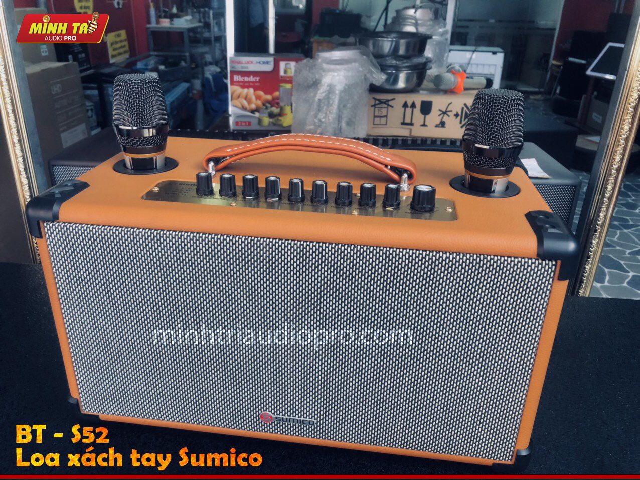 Sumico BT-S52 có thiết kế thẩm mỹ cao, hướng đến người tiêu dùng khó tính nhất. Loa được bọc chất liệu da công nghiệp PU cao cấp màu sa huỳnh rất sang trọng. 8 góc cạnh được bọc cao su chống va đập sờn góc vừa tôn lên vẻ đẹp độc đáo và khác biệt. Lưới e-căng chất liệu cao cấp bằng linen được chọn lọc để hợp tông màu với da loa. Hàng nút chỉnh đầy đủ chức năng cho âm nhạc và ca hát.