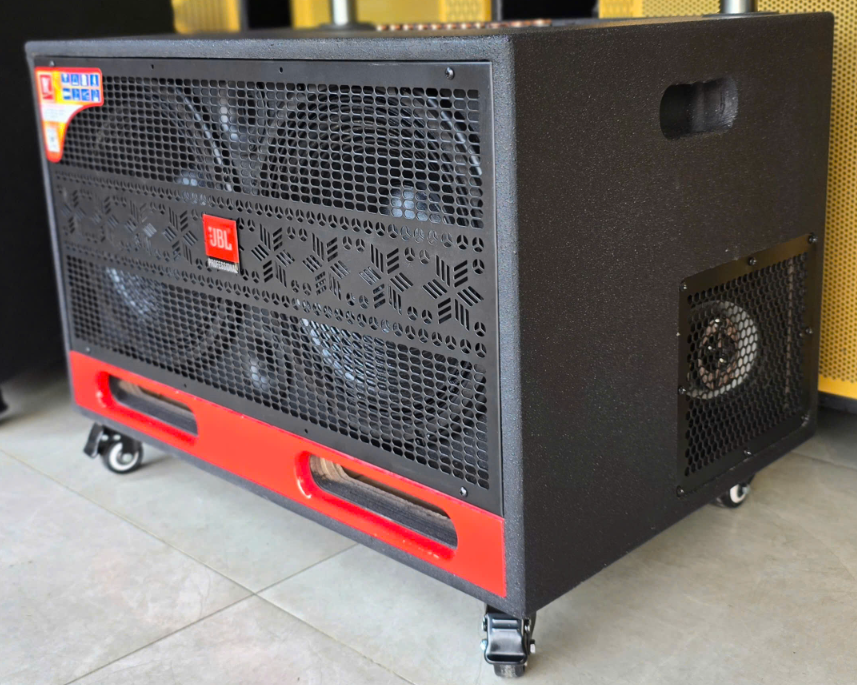 Loa kéo 3 tấc đôi H-980 2 bass 30 coil 76 từ neo 2 treble Neo bi 750 2 loa đồng trục tích hợp thêm 1 trung 1 treble Bo mạch công suất HS980 Bình 12v-30ah 1 bộ micro 2 màn hình Vỏ thùng chất liệu ván ép 17mm