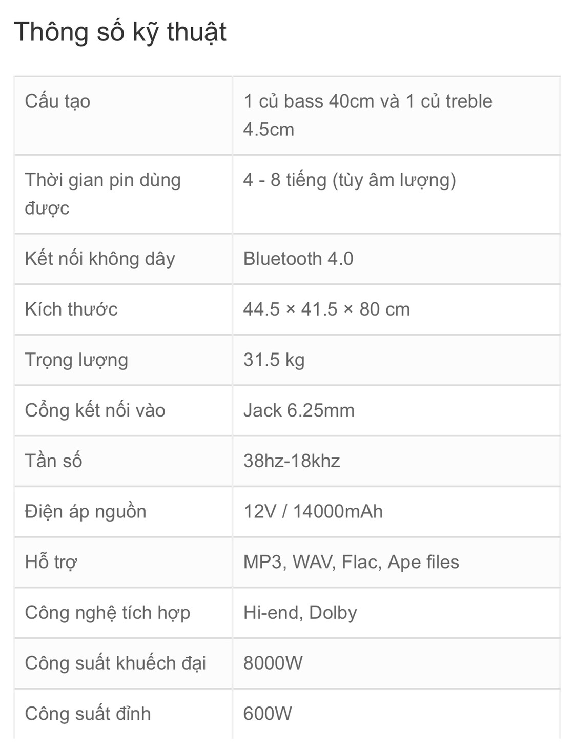 Được sử dụng pin cao cấp cho phép loa có thể hoạt động thả ga từ 4-8 tiếng mà không cần lo lắng. Mặt khác người dùng có thể sử dụng nguồn điện trực tiếp 220V, sạc ngoài bằng bình acquy 12V để mang đến sự ổn định khi hoạt động. Bộ micro được tích hợp đi kèm chất lượng, hút âm, không bị rè, méo tiếng , âm thanh ra chân thực, sống động hơn.