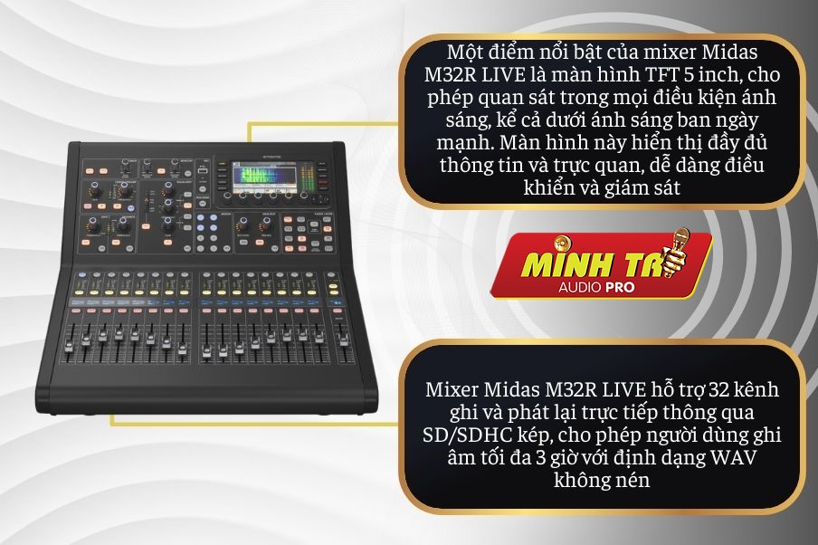 Bàn Mixer Midas M32R LIVE là bàn điều khiển kỹ thuật số dành cho biểu diễn và phòng thu với thiết kế hiện đại sang trọng, hệ thống kết nối đa năng cùng nhiều công cụ kỹ thuật số tiên tiến, hiện đại. Suốt 40 năm qua xứng đáng là sự lựa chọn tốt nhất cho nhu cầu của mọi người dùng. Cùng Minh Trí Audio đi tìm hiểu kỹ hơn về các tính năng của thiết bị này qua bài viết dưới đây nhé.