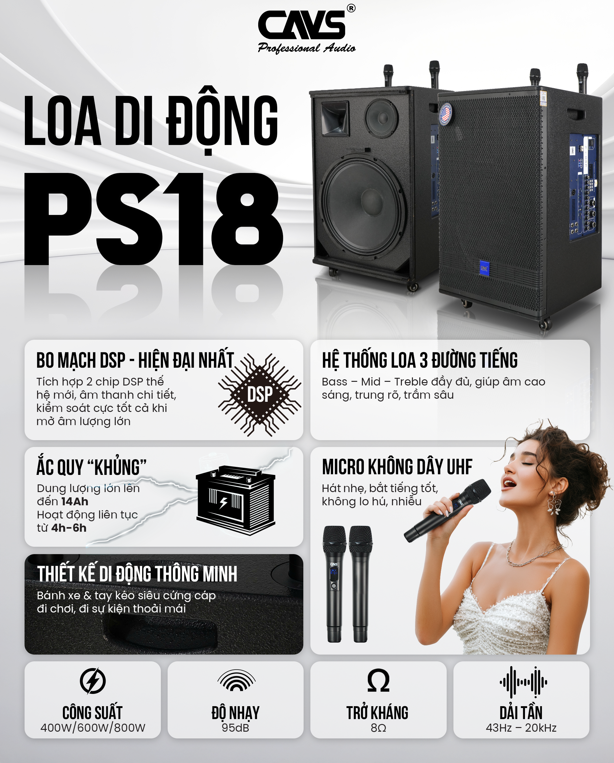 Nếu bạn đang tìm kiếm một chiếc loa kéo cao cấp – mạnh mẽ – đáng tin cậy để làm chủ mọi buổi tiệc, sự kiện hay đơn giản là không gian giải trí tại gia, thì Loa Di Động CAVS PS18 chính là sự lựa chọn không thể hoàn hảo hơn.