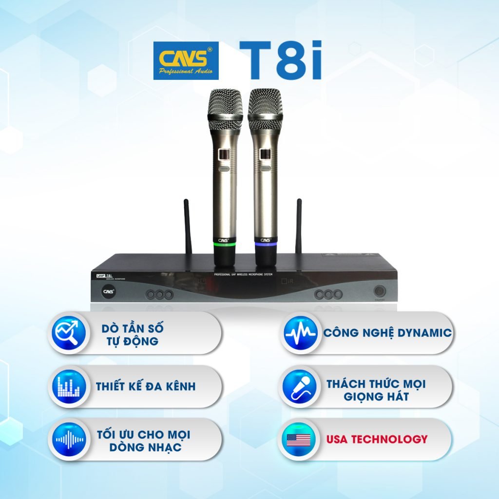 Thương hiệu CAVS đã cho ra mắt dòng sản phẩm micro không dây cao cấp Model CAVS T8i là sản phẩm tiếp nối sự thành công của Model CAVS 2000SE, 2000SE II với những chức năng hiện đại, chất âm cực hay, xứ lý các tạp âm, làm cho âm sắc trong trẻo, sạch và ẩm hơn, độ nhạy và bắt micro tốt hơn