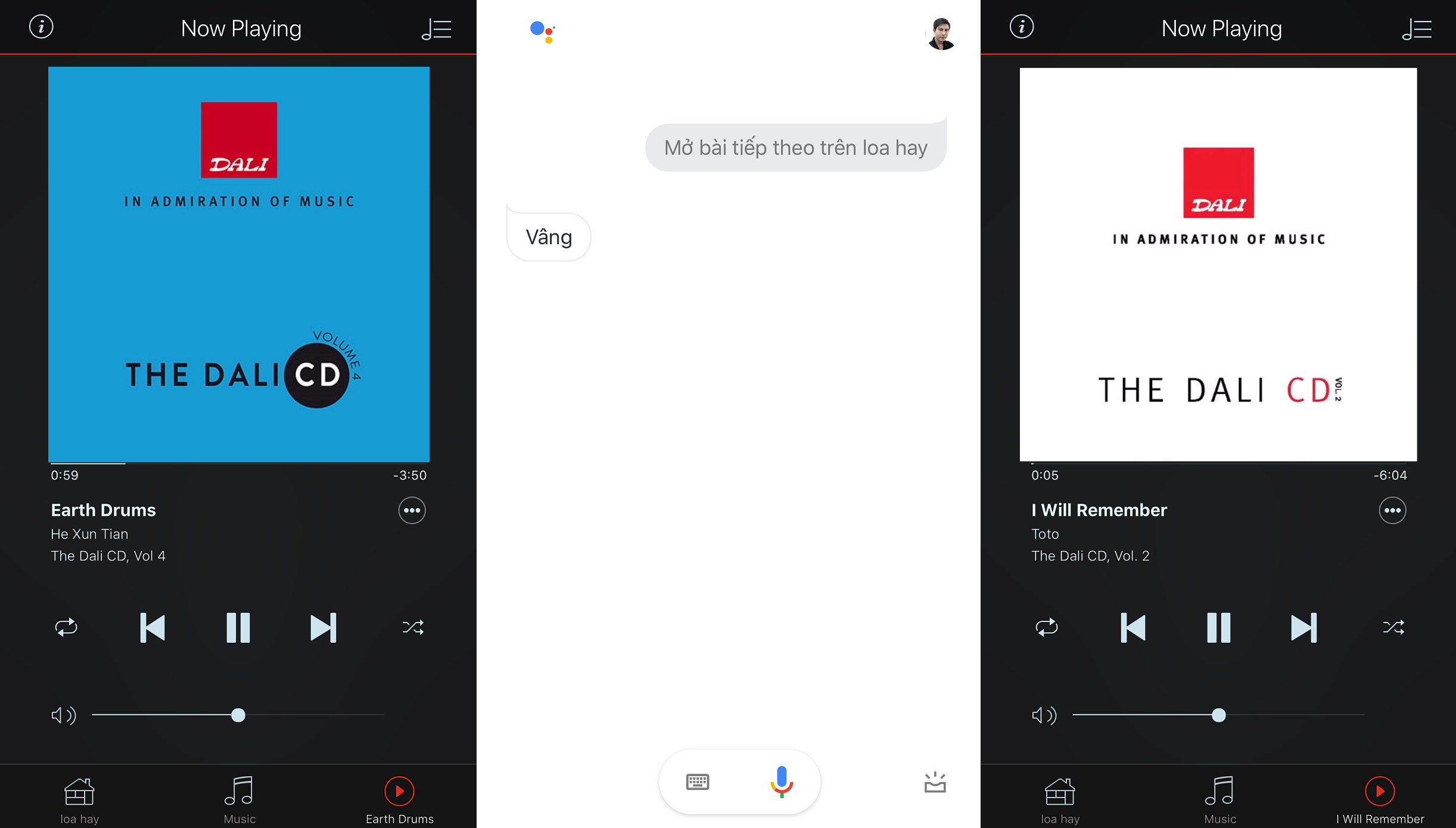 Thiết bị HEOS đang phát nhạc, bạn mở ứng dụng Google Assistant, nhấn chọn icon Micro hoặc nói " Ok Google" / "Hey Google" là có thể bắt đầu ra khẩu lệnh yêu cầu tắt tiếng, bật tiếng, tăng/giảm volume, dừng/tiếp tục phát nhạc, phát bài nhạc tiếp theo.