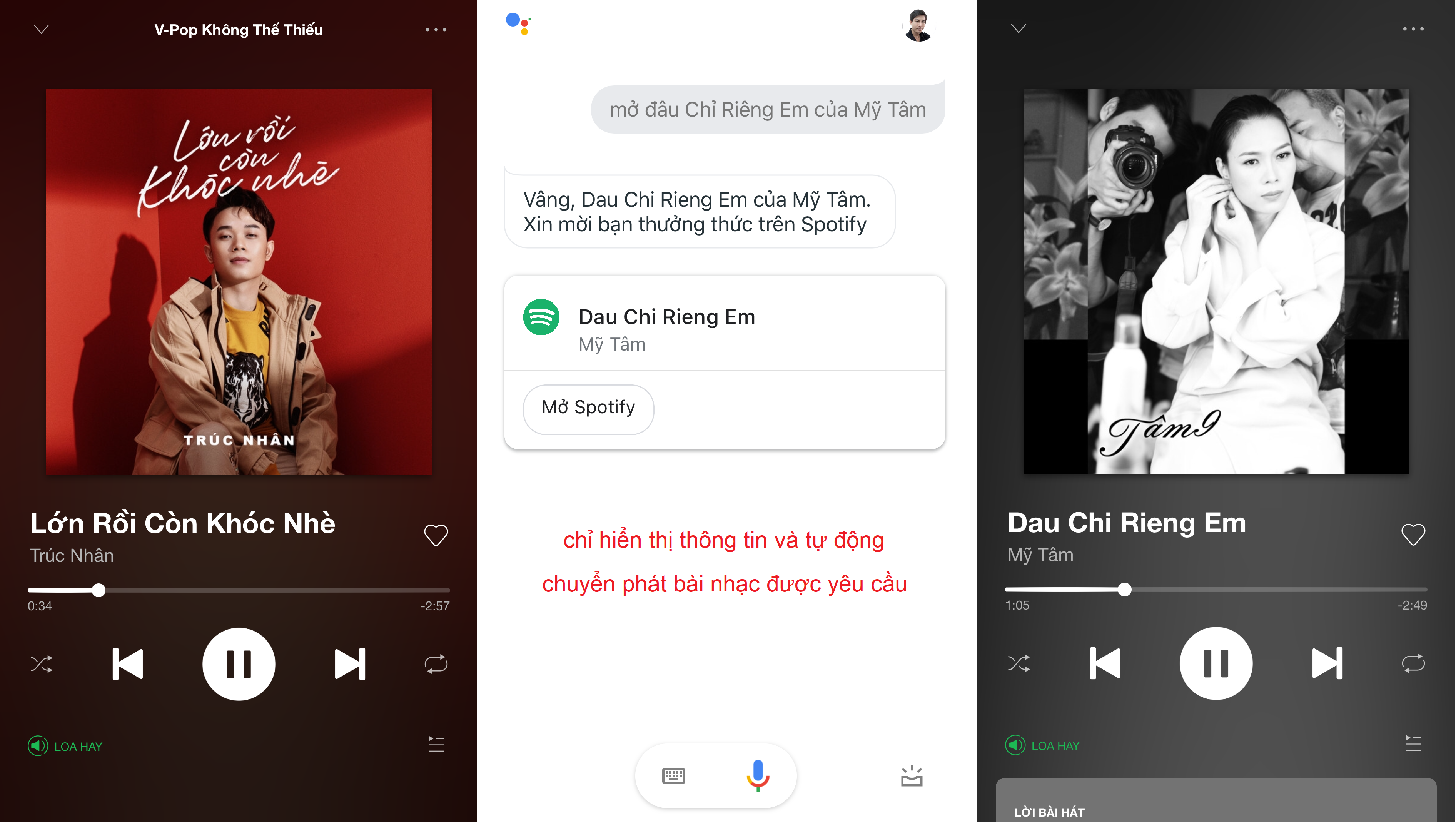 Khi HEOS đang phát nhạc từ Spotify, bạn mở ứng dụng Google Assistant, nhấn chọn icon Micro hoặc nói " Ok Google" / "Hey Google" là bạn có thể bắt đầu ra khẩu lệnh yêu cầu mở bất kỳ 1 bài hát ( bản nhạc ) nào. Google Assistant sẽ tự động truy vấn và thực hiện liên kết với Spotify để phát nhạc. Lưu ý trong khẩu lệnh yêu cầu tìm kiếm nên nói bài hát (bản nhạc) đó của ai để tăng độ chính xác của từ khóa. Lúc này, các yêu cầu tắt tiếng, bật tiếng, tăng/giảm volume, dừng/tiếp tục phát nhạc, phát bài nhạc tiếp theo cũng được thực hiện rất dễ dàng