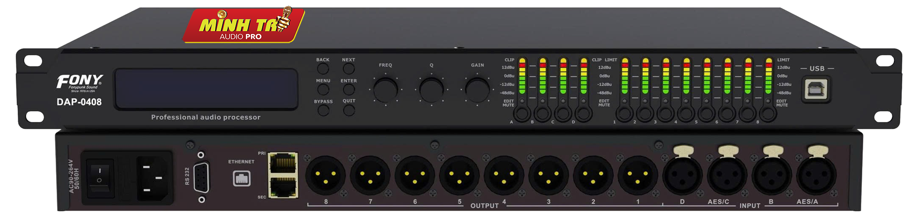 Phần mặt sau của FONY DAP-0408 được bố trí cực kỳ khoa học với các cổng XLR cao cấp, đảm bảo độ bền và tín hiệu ổn định. Hệ thống cổng USB, RS232 và TCP/IP được sắp xếp gọn gàng, dễ thao tác khi kết nối hoặc cấu hình mạng. Kích thước 483x215x44.5mm cùng trọng lượng chỉ 3.8kg giúp thiết bị dễ lắp đặt trong nhiều không gian khác nhau.