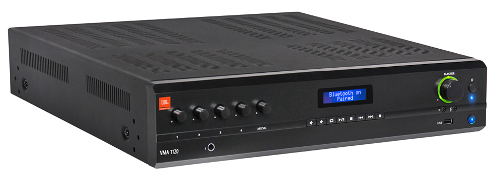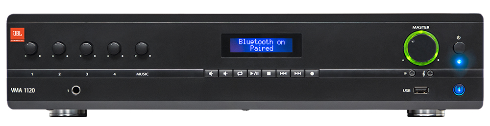 JBL VMA 1120 có 5 đầu vào với tính ra tổng hợp đơn âm và 1 đầu ra với công suất đầu ra 120W. JBL VMA 1120 truyền phát nhạc không dây qua bluetooth hoặc kết nối ổ USB với cổng USB Type-A của bảng mặt trước Amply. Như vậy, VMA 1120 với trình phát đa phương tiện có khả năng phát các tệp MP3 từ thiết bị Bluetooth hoặc ổ USB.