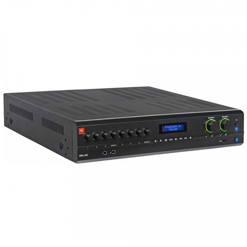 JBL VMA 260 có 8 đầu vào với tính ra tổng hợp đơn âm và 2 đầu ra với công suất đầu ra 60W. JBL VMA 260 truyền phát nhạc không dây qua bluetooth hoặc kết nối ổ USB với cổng USB Type-A của bảng mặt trước Amply. Như vậy, VMA 260 với trình phát đa phương tiện có khả năng phát các tệp MP3 từ thiết bị Bluetooth hoặc ổ USB. Định tuyến các nguồn khác thông qua Jack cắm đầu vào Euroblock, RCA và 1/4". Định tuyến đến đầu ra Euroblock có thể định cấu hình. VMA 260 tích hợp cung cấp các điều khiển mức, cũng như âm trầm và âm bổng cho mỗi kênh. Bên cạnh đó, Amply VMA 260 cũng hỗ trợ tắt tiếng và tắt tiếng ưu tiên.