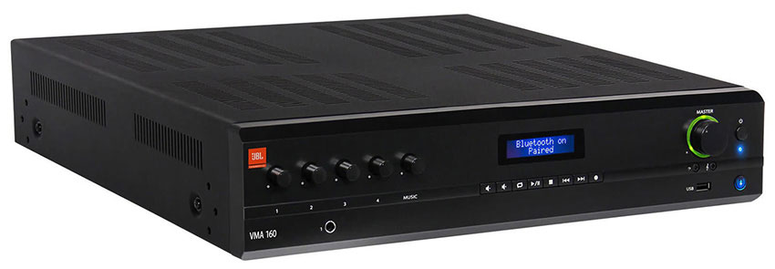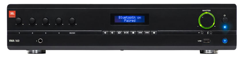 JBL VMA 160 truyền phát nhạc không dây qua bluetooth hoặc kết nối ổ USB với cổng USB Type-A của bảng mặt trước Amply. Như vậy, VMA 160 với trình phát đa phương tiện có khả năng phát các tệp MP3 từ thiết bị Bluetooth hoặc ổ USB. Định tuyến các nguồn khác thông qua Jack cắm đầu vào Euroblock, RCA và 1/4". Định tuyến đến đầu ra Euroblock có thể định cấu hình. VMA 160 tích hợp cung cấp các điều khiển mức, cũng như âm trầm và âm bổng cho mỗi kênh. Bên cạnh đó, Amply VMA 160 cũng hỗ trợ tắt tiếng và tắt tiếng ưu tiên.