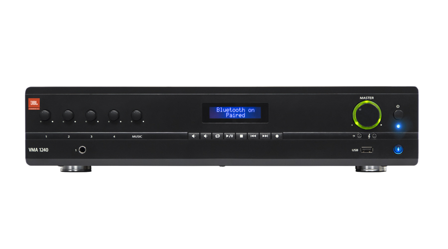 Amply tích hợp JBL VMA1240 là bộ amply khuếch đại cho dự án hệ thống âm thanh thương mại tích hợp Bluetooth. Hỗ trợ kết nối 5 ngõ vào Input và 1 đầu ra công suất 240W, JBL VMA1240 cho khả năng phát nhạc thông qua Bluetooth hoặc kết nối USB qua cổng USB Type-A ở mặt trước. Đồng thời ở mặt sau các ngõ vào khác lần lượt thông qua jack cắm Input Euroblock, RCA hay ¼”. VMA1240 đem đến cho người dùng khả năng điều chỉnh âm lượng và EQ âm trầm, âm bổng cho mỗi kênh. Ngoài ra, Amply tích hợp VMA1240 cũng hộ trợ tắt tiếng và ducking tiếng ưu tiên.