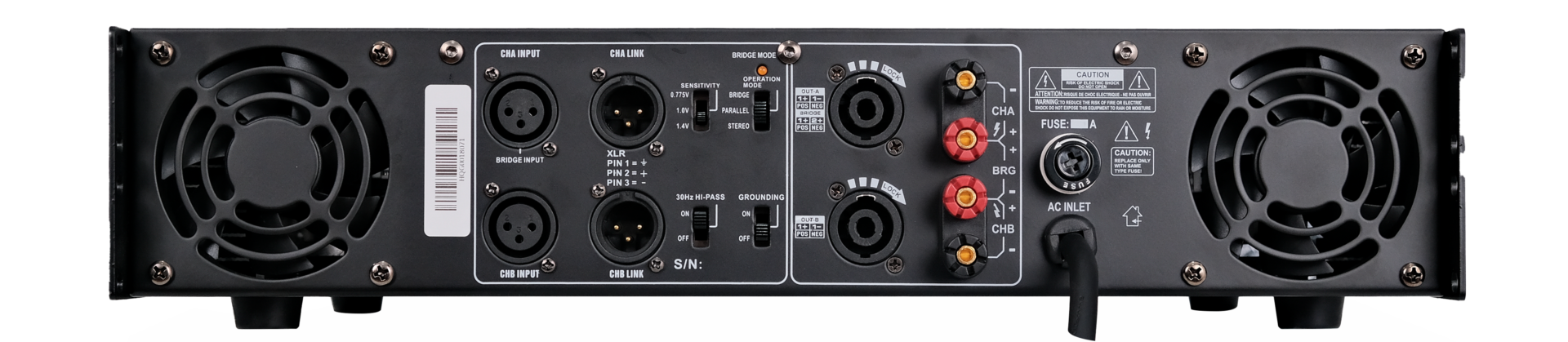 Mặt sau của cục đẩy công suất LEQI AUDIO KG-800 được bố trí khoa học và đầy đủ các cổng kết nối, đáp ứng tốt nhu cầu lắp đặt trong các hệ thống âm thanh chuyên nghiệp. Thiết bị trang bị hai quạt tản nhiệt lớn giúp làm mát hiệu quả, đảm bảo hoạt động ổn định trong thời gian dài và ngăn ngừa tình trạng quá nhiệt khi chạy công suất cao. Tổng thể thiết kế của LEQI KG-800 vừa bền bỉ, vừa thân thiện với người sử dụng, phù hợp với nhiều không gian lắp đặt từ phòng karaoke đến sân khấu chuyên nghiệp.