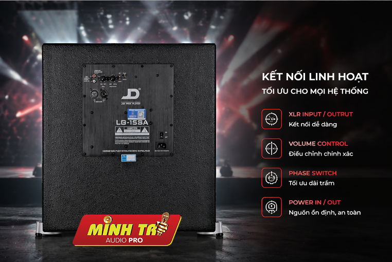 Mặt sau của LG-15SA là cụm bảng điều khiển và kết nối được bố trí khoa học, gồm các cổng Input/Output XLR, núm điều chỉnh âm lượng, tần số cắt và công tắc đảo pha, cho phép người dùng tùy chỉnh âm trầm phù hợp với từng không gian và nhu cầu. Ngoài ra, cổng nguồn AC và khe tản nhiệt cũng được thiết kế hợp lý, giúp đảm bảo khả năng hoạt động ổn định trong thời gian dài. Sự kết hợp giữa thiết kế thẩm mỹ, cấu trúc chắc chắn và tính tiện dụng khiến LG-15SA trở thành lựa chọn lý tưởng cho hệ thống âm thanh sân khấu, hội trường hay karaoke chuyên nghiệp.