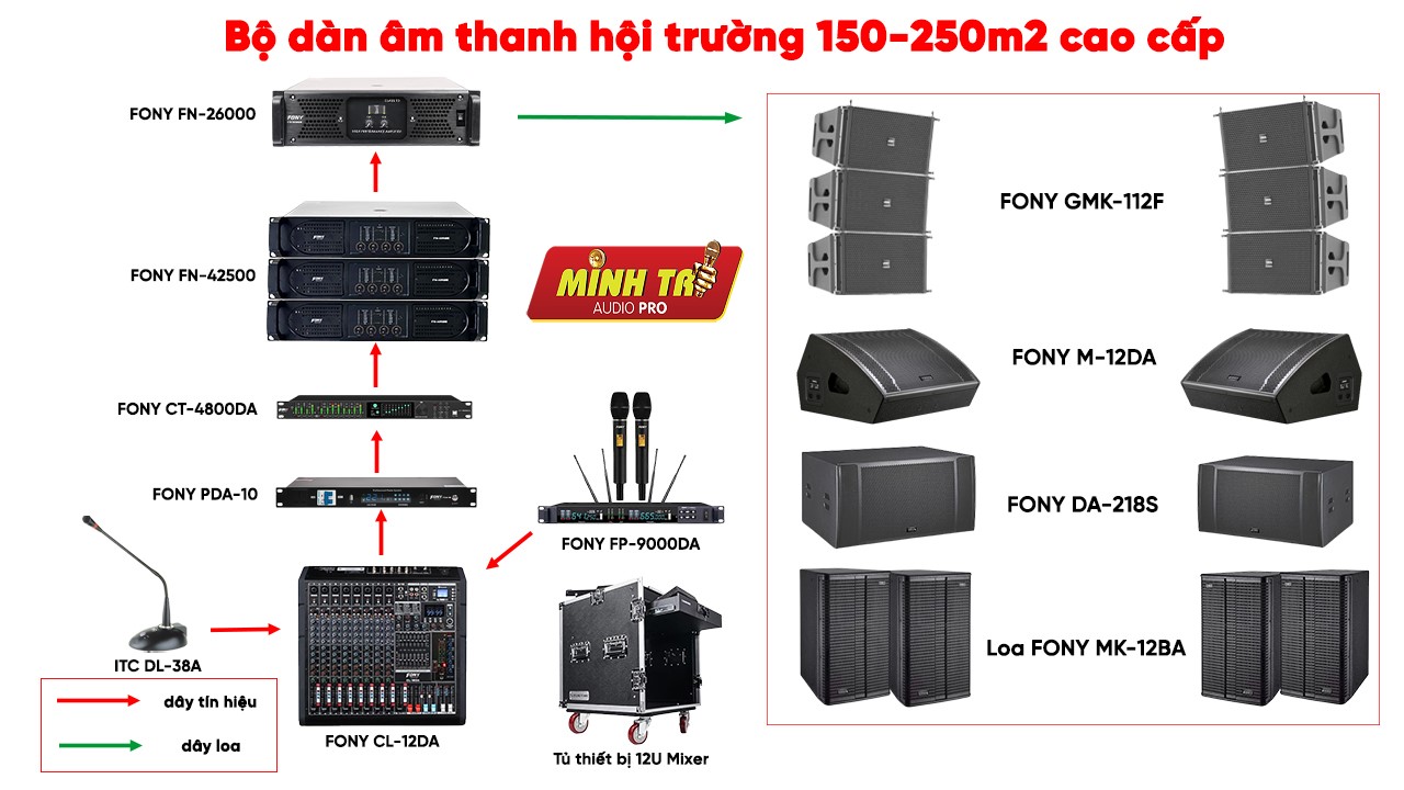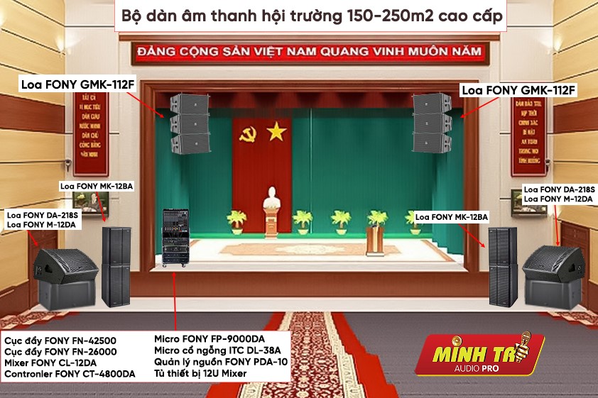 Cấu hình dàn âm thanh cho hội trường diện tích 150-250m2 cao cấp gồm: