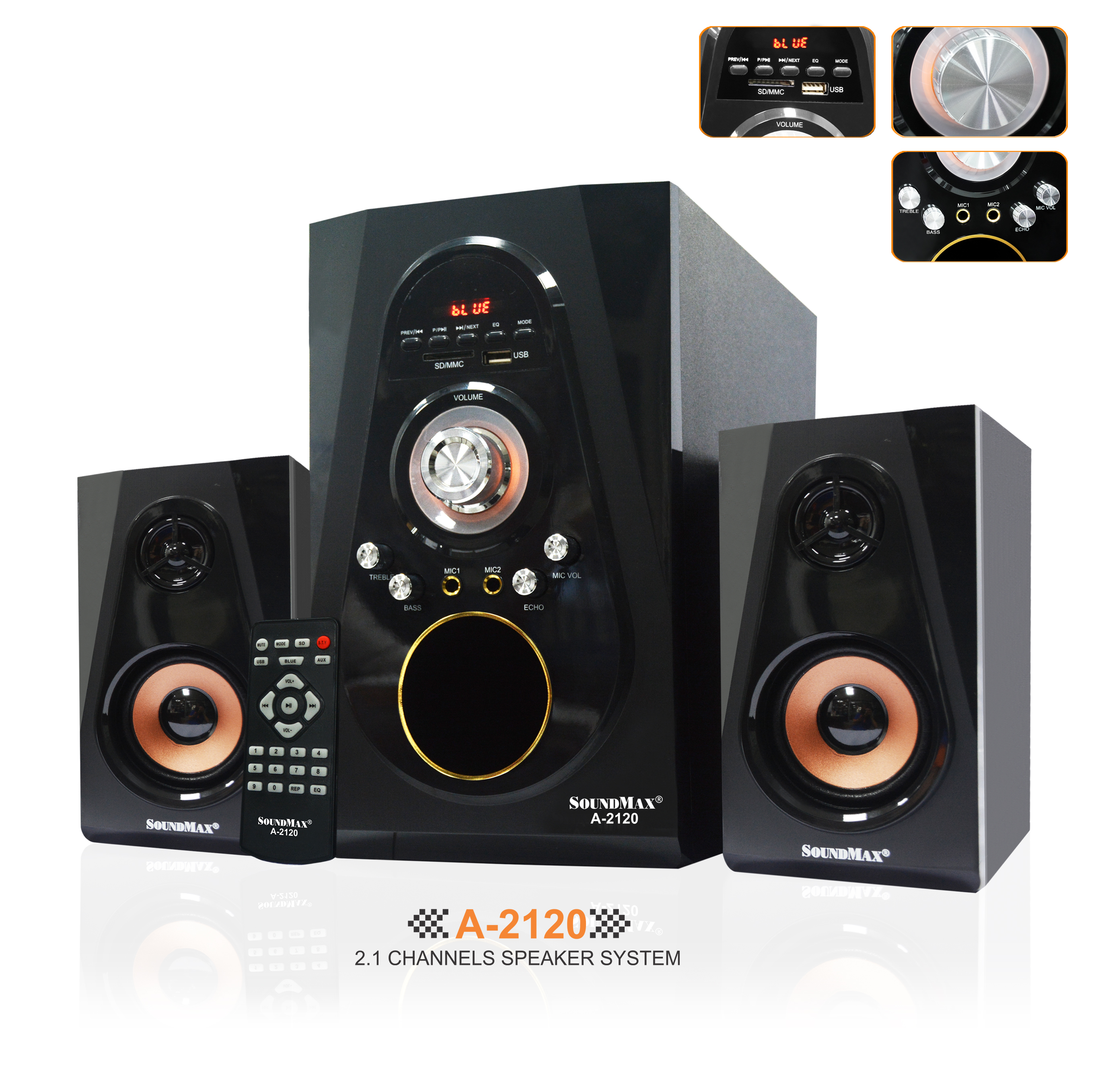 Loa Vi Tính Soundmax A-2120/2.1 Tích Hợp Bluetooth 4.0 có thiết kế sang trọng, kết hợp với những đường góc cạnh tinh tế mang lại sự độc đáo cho chiếc loa vi tính một phong cách âm nhạc hoàn toàn mới cho giới trẻ, năng động và sáng tạo.