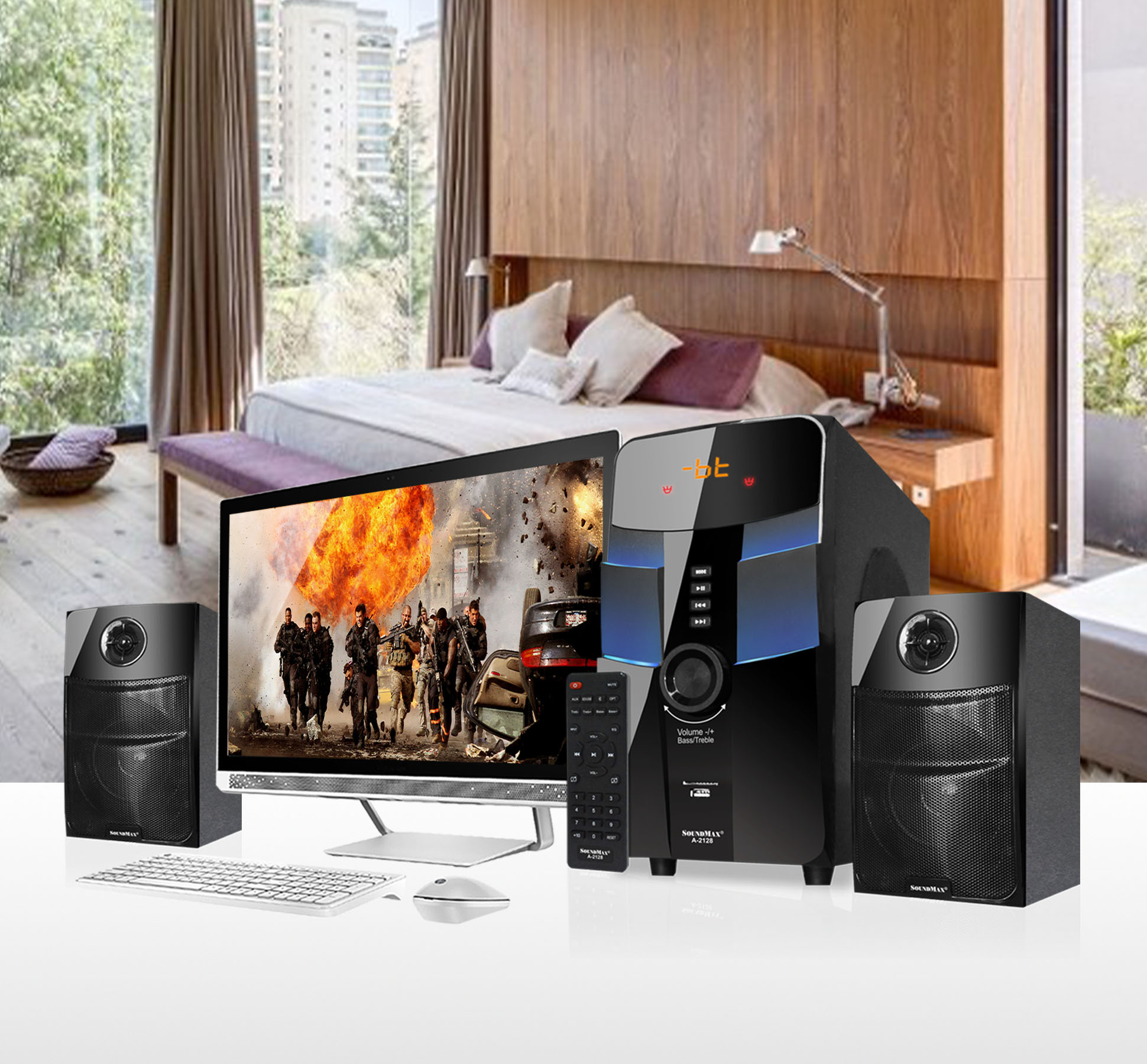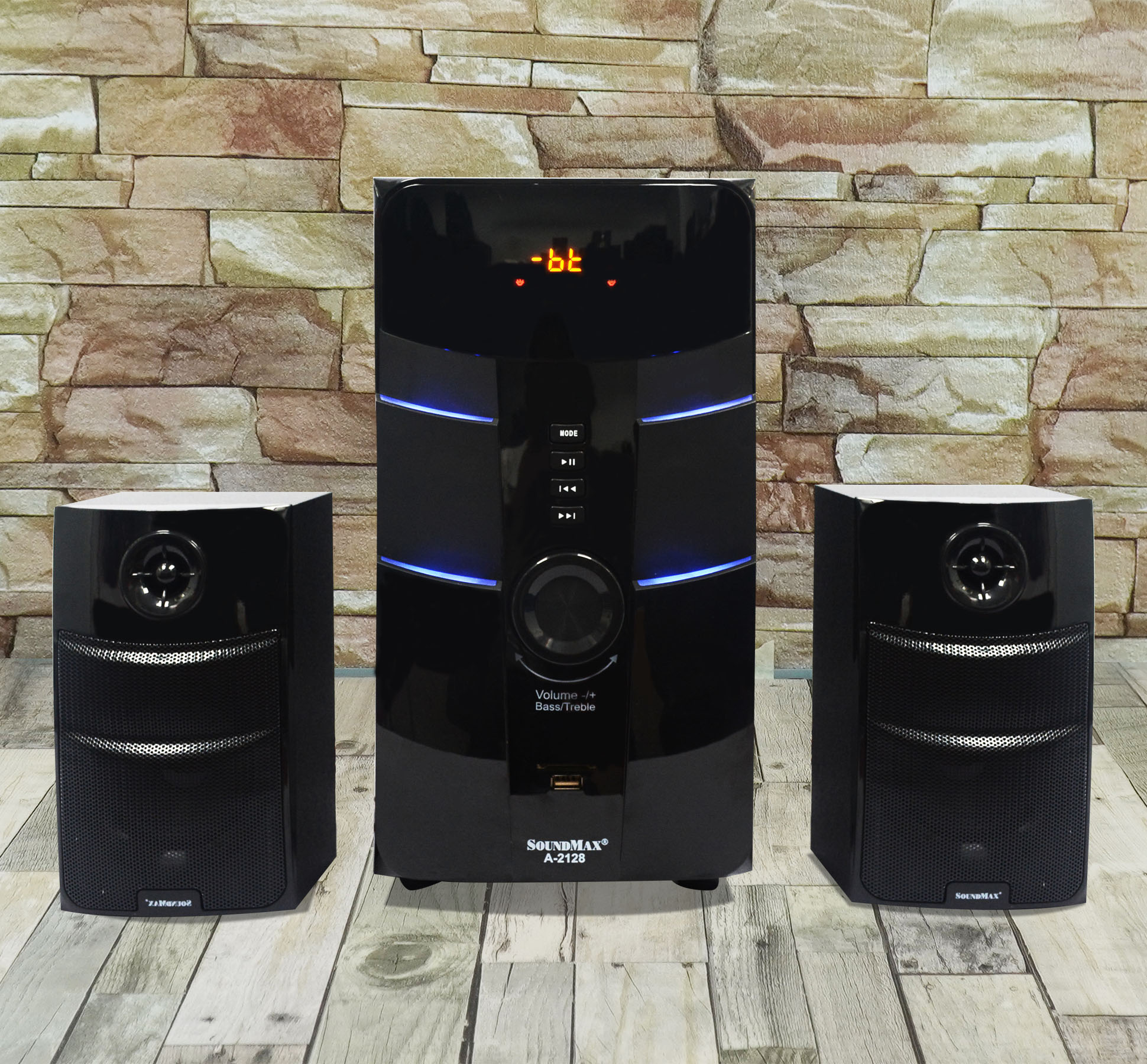 Loa vi tính Soundmax A-2128/2.1 khi cắm USB hay SD card vào loa sẽ chọn phát nhạc trên thiết bị vừa cắm vào, khi bạn rút USB hoặc SD card loa sẽ phát trên thiết bị còn lại, nếu rút cả USB và SD card ra loa sẽ phát trên ngõ AUX, bạn có thể chủ động chọn ngõ vào hoạt động USB/SD/AUX bằng cách bấm phím "MODE" trên loa, hoặc nhấn phím AUX, USB, SD trên Remote. Loa vi tính Bluetooth này khi tắt điện, loa đang phát trên thiết bị USB hoặc SD Card thì khi mở điện lại loa sẽ ưu tiên phát trên thiết bị đó, khi đang phát trên ngõ AUX khi bạn tắt điện mở lại loa sẽ phát trên SD card. Sản phẩm được thiết kế gam màu đen sang trọng, thùng loa bằng gỗ vừa bền, vừa cho âm thanh hay và sống động hơn, bảng điều khiển được bố trí ở loa siêu trầm giúp bạn điều chỉnh âm thanh: Volume, Bass, Treble dễ dàng.