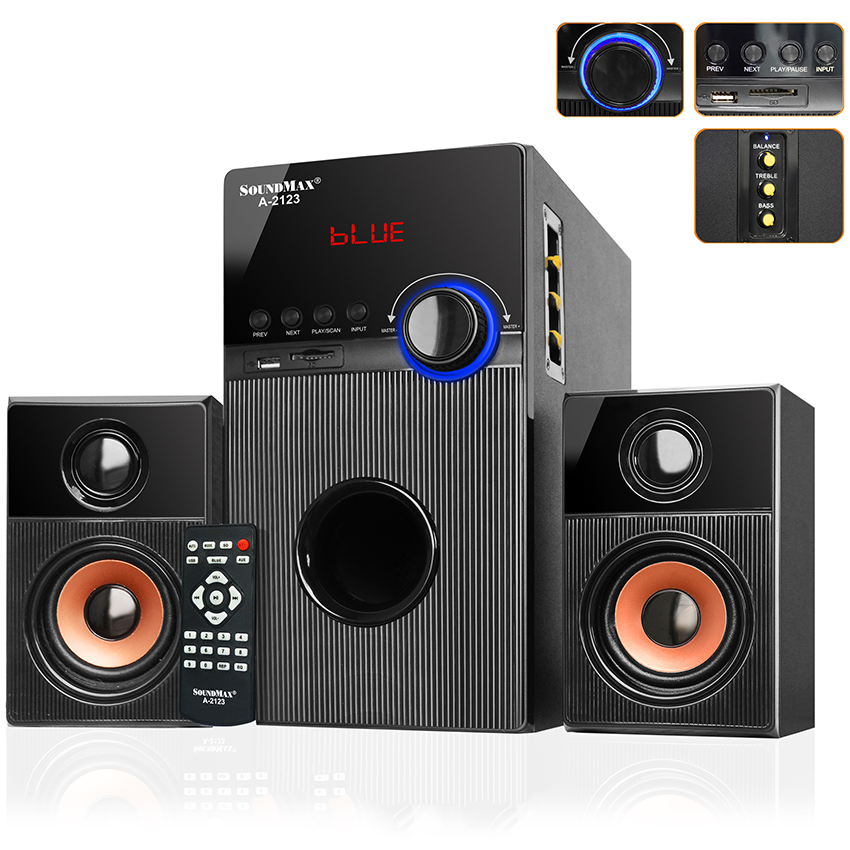 Loa Vi Tính Soundmax A-2123/2.1 Tích Hợp Bluetooth 4.0 được cấu tạo từ 2 loa thành phần và một loa siêu trầm tích hợp mạch xử lý âm thanh, các cổng giao tiếp như ngõ vào/ra âm thanh. Ngoài khả năng chơi nhạc từ các nguồn phát âm thanh analog (qua ngõ 3,5mm, RCA), chức năng chơi nhạc từ thẻ nhớ SD/bút nhớ USB và trang bị remote thì còn được tích hợp thêm khả năng chơi nhạc từ các nguồn phát không dây hỗ trợ chuẩn kết nối Bluetooth rất tiện lợi.
