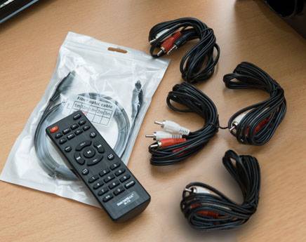 SoundMax còn cung cấp kèm đầy đủ phụ kiện theo bộ loa 5.1 kênh này, trong đó có cả cáp quang, đủ lượng cáp cho kết nối 5.1 và thiết bị điều khiển từ xa.