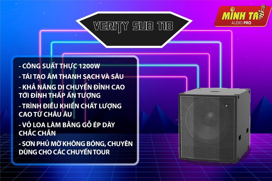 Loa Verity Sub 118 là loa siêu trầm cao cấp có cấu tạo loa woofer 18 inch với cuộn voice coil 4 inch và khung hợp kim nhôm. Cấu tạo này giúp loa đạt được hiệu suất phát âm tốt nhất và hoạt động tốt ở tần số 32Hz. Vỏ loa được thiết kế một cách tối ưu để tương thích với trình điều khiển (18″ ultra-low frequency driver) và công nghệ ống phát có đường kính không đều (unequal diameter radiant tube) giúp tăng hiệu suất phát âm và giảm yêu cầu về công suất của ampli, từ đó giảm chi phí của hệ thống.