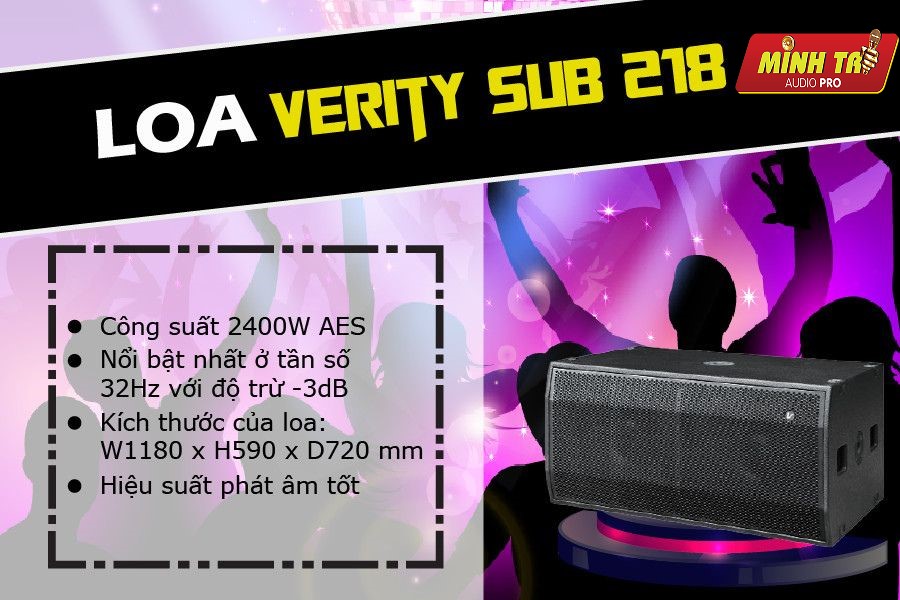 Loa Subwoofer Verity SUB218 sử dụng hai trình điều khiển 18 inch với màng loa bằng sợi carbon và nam châm ferret, kết hợp cuộn dây âm thanh 4 inch, mang đến công suất lên đến 2400W (AES) và công suất chương trình đạt 4800W. Với trở kháng danh định 4Ω và độ nhạy 103dB/W/m, loa tái tạo âm trầm đầy uy lực, rõ ràng, đáp ứng dải tần từ 28Hz đến 2.2kHz. Đây là lựa chọn hoàn hảo để nâng cao chất lượng âm thanh cho các hệ thống PA chính, sân khấu, hoặc các buổi trình diễn trong nhà và ngoài trời.