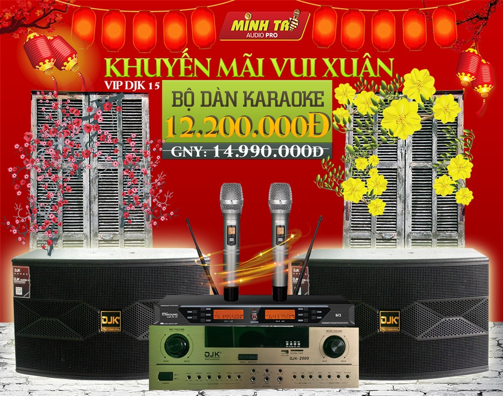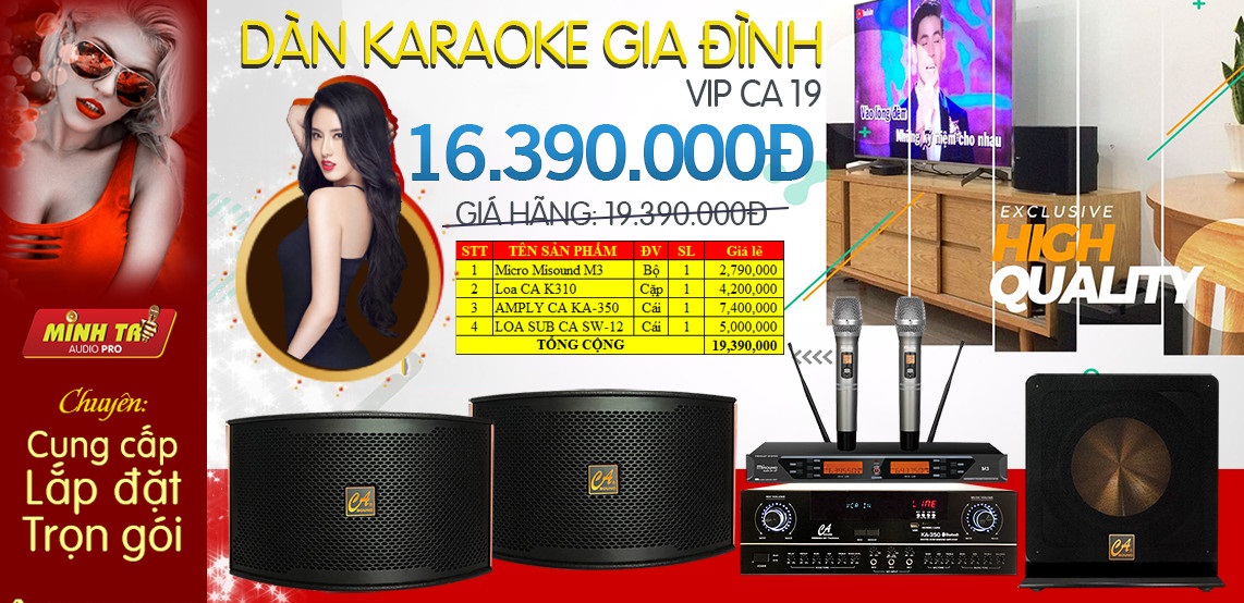 Thông thường 1 bộ dàn âm thanh chuẩn thường bao gồm những thiết bị sau : Amply karaoke, bộ loa karaoke, loa sub, micro, cục đẩy công xuất, mixer và đầu karaoke.