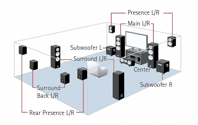 ==> LƯU Ý : Đối với âm thanh 3d cho rạp chiếu phim tại gia, chúng ta nên bố trí nhiều vật liệu hút âm ở tường phía trước cũng như ở vị trí gương của tường 2 bên (là vị trí nếu ta đặt tầm gương trên tường thì từ vị trí nghe sẽ nhìn thấy vị trí nguồn âm). Điều này sẽ tăng tính định hướng của âm thanh đến từ phía trước cũng như giúp lời thoại trong phim trở nên rõ hơn. Tường phía sau vị trí người xem nên bố trí nhiều vật liệu tán âm. Các hiệu ứng surround sẽ trở nên rộng hơn và tự nhiên hơn (giảm tính định hướng của loa surround và các hiệu ứng ping-pong khi mà người xem có cảm giác âm thanh chạy lần lượt qua 2 chiếc loa giống như 2 điểm ping – pong chứ không phải một hiệu ứng vòm liền lạc). Đối với những âm thanh đến từ phía trước như loa Front hay loa Center, chúng ta cần sự định hướng của âm thanh cao do những âm thanh được gắn liền với hình ảnh mà mắt quan sát được. Tuy nhiên với hiệu ứng surround, khi mà tiếng động phát ra từ sau lưng và mắt ta không quan sát được hình ảnh, việc giảm tính định hướng của âm thanh giúp ta có cảm giác trường âm rộng hơn và hiệu quả surround trở nên thú vị hơn. Cũng vì lý do này mà một số loa surround được chế tạo đa hướng (bi-polar surround) Loa surround đa hướng.