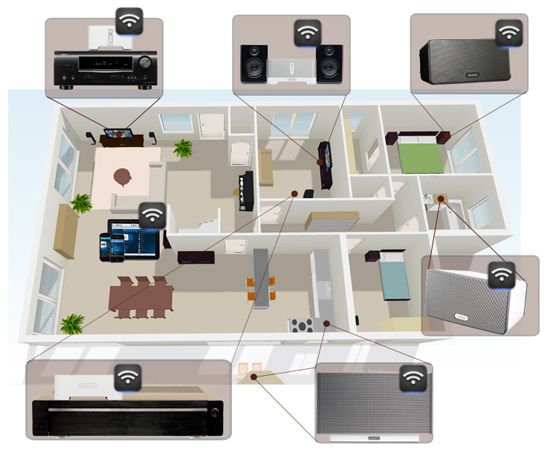 Nguồn âm thanh: Nguồn âm thanh được phát có thể đến từ các dịch vụ phát nhạc trực tuyến như Micro, Spotify, YouTube, điện thoại thông minh, máy tính, đĩa CD,… Cần có thiết bị điều khiển âm thanh đa vùng là bộ nguồn âm thanh như là một bộ nhớ dùng để lưu trữ toàn bộ hệ thống âm thanh đa vùng của ngôi nhà trong ổ cứng. Bộ lưu trữ là rất cần thiết cho một hệ thống hoàn chỉnh, có bộ nhớ lưu trữ để lưu giữ một số bài nhạc, thì hệ thống vẫn hoạt động bình thường kể cả khi thiếu các thiết bị kết nối vụ USB và Smartphone.