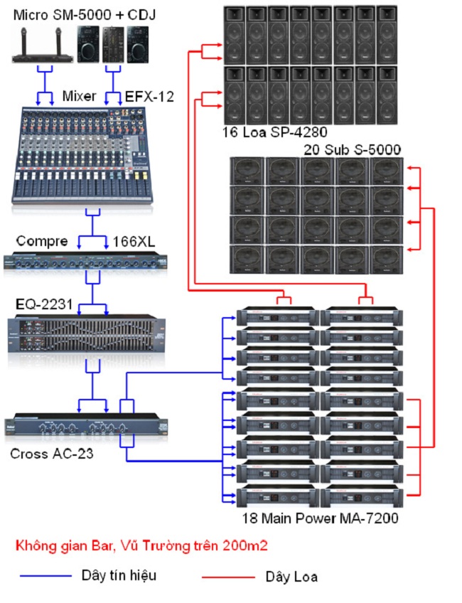 + Vang số: Một trong những thiết bị không thể thiếu trong hệ thống dàn âm thanh quán Bar chuyên nghiệp là vang số. Vang số cho chất tiếng mượt hơn hay hơn ở các dải bass, trung, treble, giới hạn được âm lượng đầu vào, cắt các dải âm thanh làm hư hại đến loa. Xử lý các hiệu ứng nhạc cực hay, hiệu ứng micro tuyệt vời nhất, tiếng mic mượt mà, với hiệu ứng echo, reved cực hay, cắt các dải gây hú rít cực tốt.