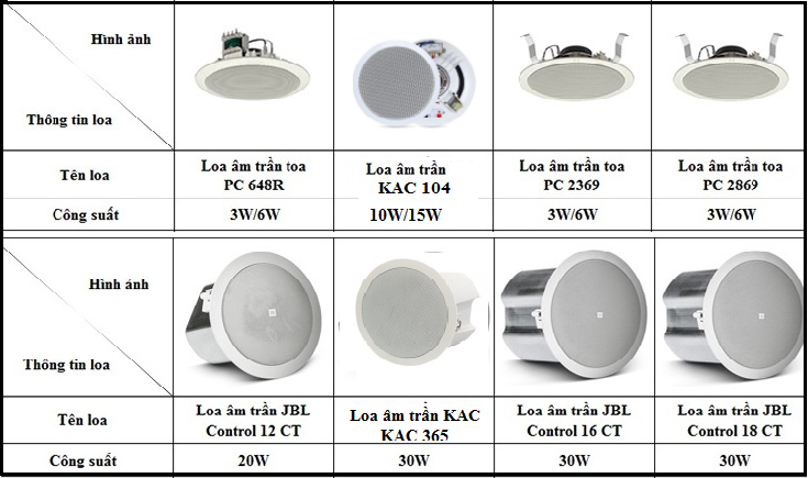 Loa âm trần có cấu tạo hình tròn chữ nhật tùy theo loại được lắp đặt trên trần thạch cao và có nhiều loại công suất khác nhau chất lượng và kích thước khác nhau phục vụ cho từng không gian nghe nhạc khác nhau trong dàn âm thanh quán cafe sân vườn