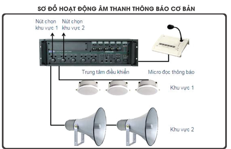 Theo như sơ đồ của hai loại hình âm thanh cơ bản trên chúng ta có thể thấy thành phần không thể thiếu được của hệ thống âm thanh thông báo chuyên nghiệp giá rẻ đó chính là micro,bộ điều khiển trung tâm, các thiết bị ngoại vi, amply và loa thông báo.