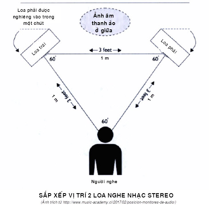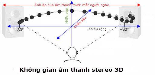 3 chiều âm thanh-3D, qua 2 loa là: chiều rộng từ loa trái qua loa phải, chiều cao: từ thấp (dưới chân) lên cao (lơ lững trên đỉnh đầu) và chiều sâu: ngay trước mắt và sâu vào phía sau 2 loa, chứ không phải là vị trí của 3 loa như nhiều người đã hiểu sai: bên trái, ở giữa và bên phải. Tuy không có loa giữa nhưng 2 loa trái phải tạo ra ảnh âm thanh ảo ở giữa 2 loa này. Đừng suy diễn sai lầm là đường kính loa trầm/woofer càng to và thùng loa càng to sẽ cho âm thanh càng hay mà kích cở loa phải tương thích với không gian nghe nhạc (chiều rộng, chiều dài và chiều cao căn phòng) và mức độ dội âm của căn phòng.
