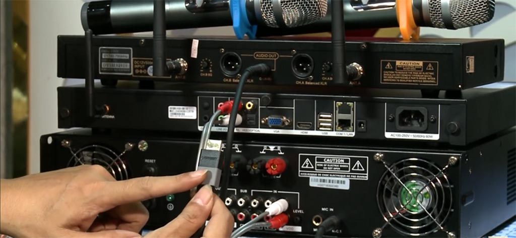 - Kết nối máy karaoke với amplifier: Sử dụng cáp RCA hoặc cáp HDMI để kết nối máy karaoke với amplifier. Đảm bảo các kết nối được thực hiện chính xác và chặt chẽ.