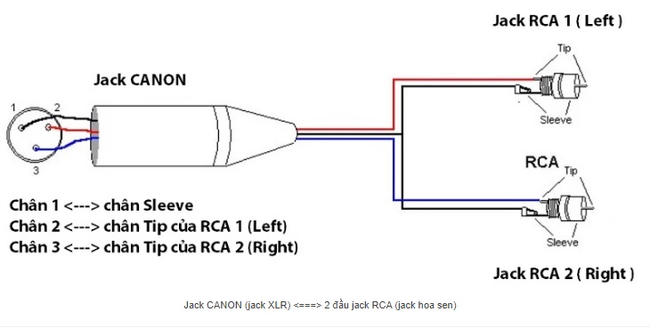 Nếu bạn muốn đấu nối 1 đầu jack Canon (mang tín hiệu Stereo) chia ra thành 2 đầu jack RCA mang tín hiệu Mono (Left và Right), thực hiện như sau: