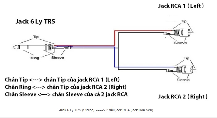 Nếu bạn muốn nối 1 đầu jack 6 ly TRS (mang tín hiệu Stereo) chia ra thành 2 đầu jack RCA mang tín hiệu Mono (Left và Right), thực hiện như sau: