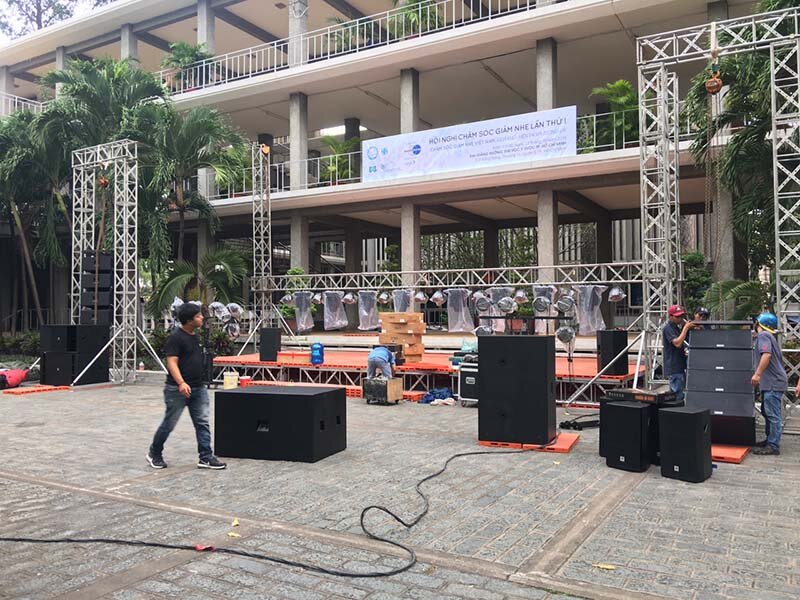 Với các sự kiện ngoài trời quy mô lớn, người ta thường sử dụng hệ thống khung treo loa, với dàn loa line array hiện đại, công suất mạnh mẽ, vừa tăng tính thẩm mỹ, vừa giúp cho âm thanh được truyền đi xa hơn. Kết hợp với đó, bạn cũng có thể đặt thêm một số loa phía trước sân khấu phục vụ cho các khán giả đứng gần.